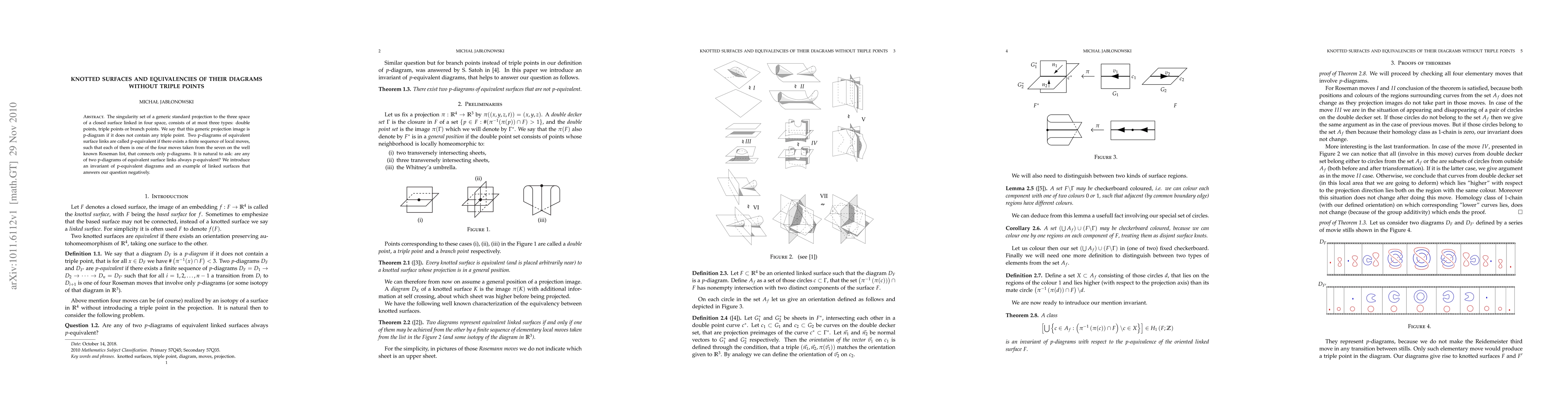 The singularity set of a generic standard projection to the three space of a closed surface linked in four space, consists of at most three types: double points, triple points or branch points. We say that this generic projection image is p-diagram if it does not contain any triple point. Two p-diagrams of equivalent surface links are called p-equivalent if there exists a finite sequence of local moves, such that each of them is one of the four moves taken from the seven on the well known Roseman list, that connects only p-diagrams. It is natural to ask: are any of two p-diagrams of equivalent surface links always p-equivalent? We introduce an invariant of p-equivalent diagrams and an example of linked surfaces that answers our question negatively.