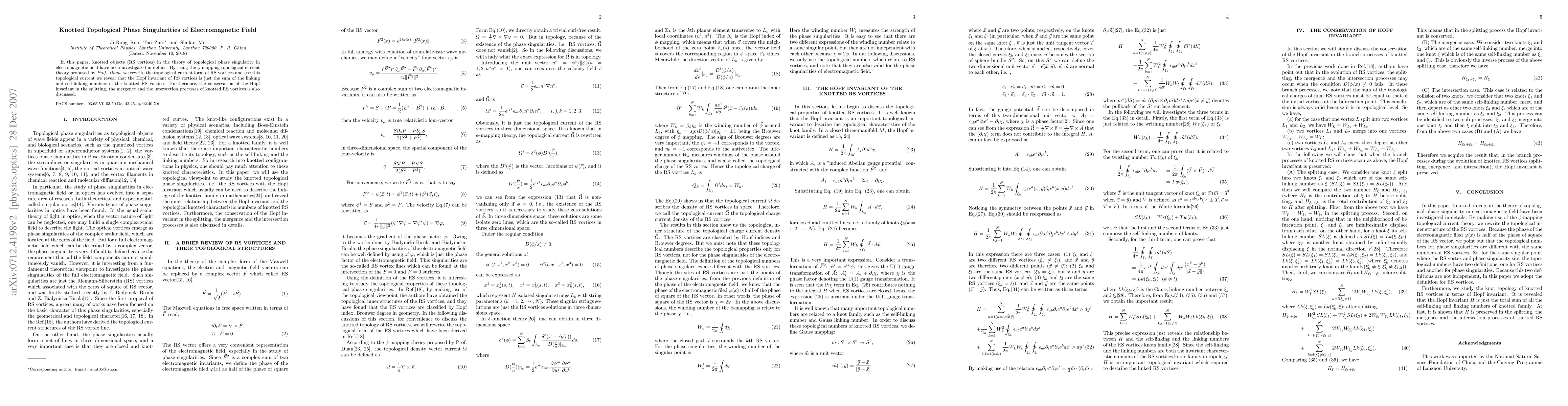 This paper investigates knotted electromagnetic field singularities (RS vortices) using $\phi$-mapping topological current theory. It reveals that the Hopf invariant of RS vortices equals the sum of their linking and self-linking numbers, and discusses the conservation of this invariant during splitting, merging, and intersection processes.