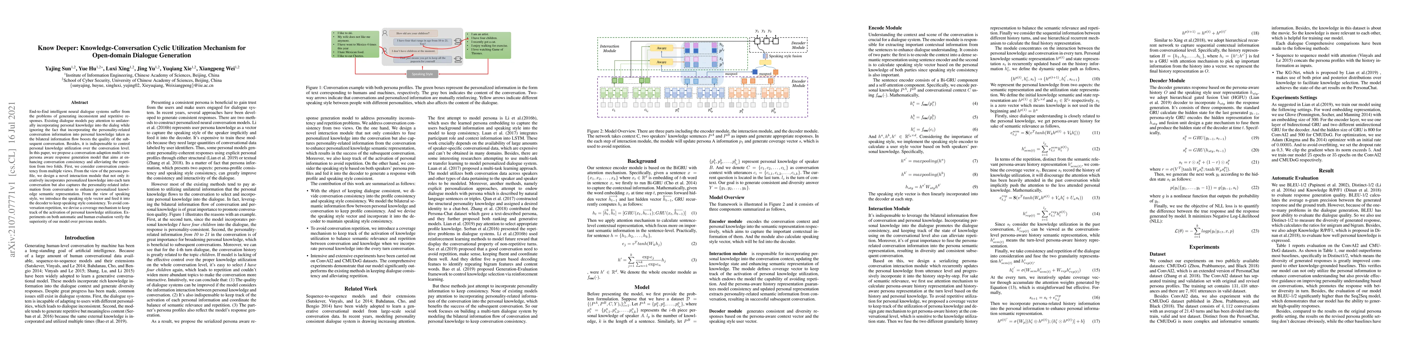 This paper proposes a novel dialogue generation model that enhances conversation consistency and reduces repetition by incorporating personality-related conversation information into personalized knowledge, and controlling knowledge utilization. The model uses an interaction module and speaking style vector to improve consistency and a coverage mechanism to prevent repetition, outperforming previous models in both automatic and human evaluations.