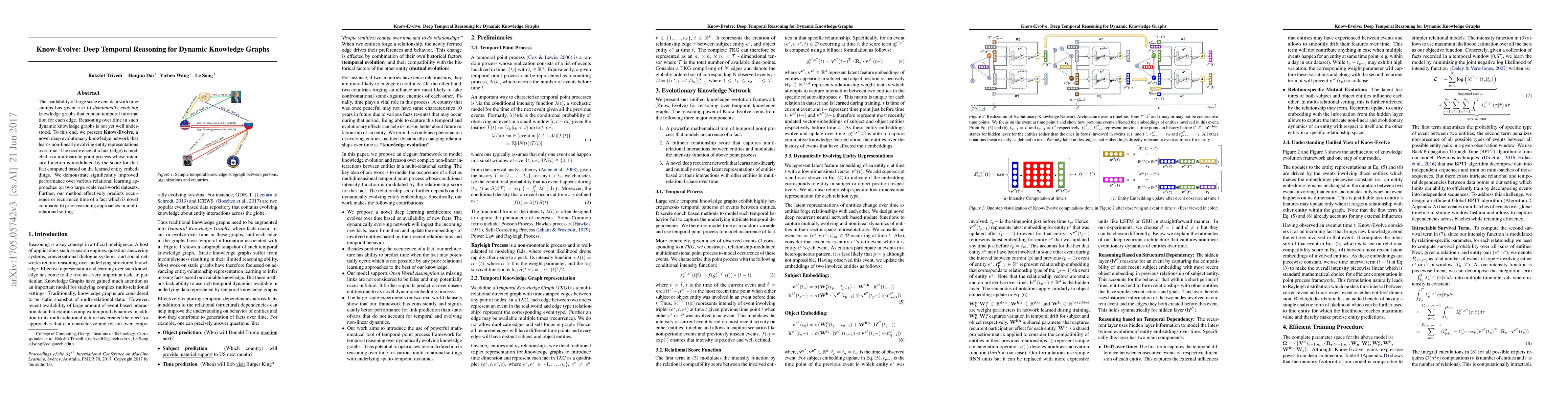 Know-Evolve introduces a deep evolutionary knowledge network for dynamically evolving knowledge graphs, improving temporal reasoning and fact prediction over time. It outperforms existing relational learning methods on large datasets and predicts the recurrence of facts effectively.