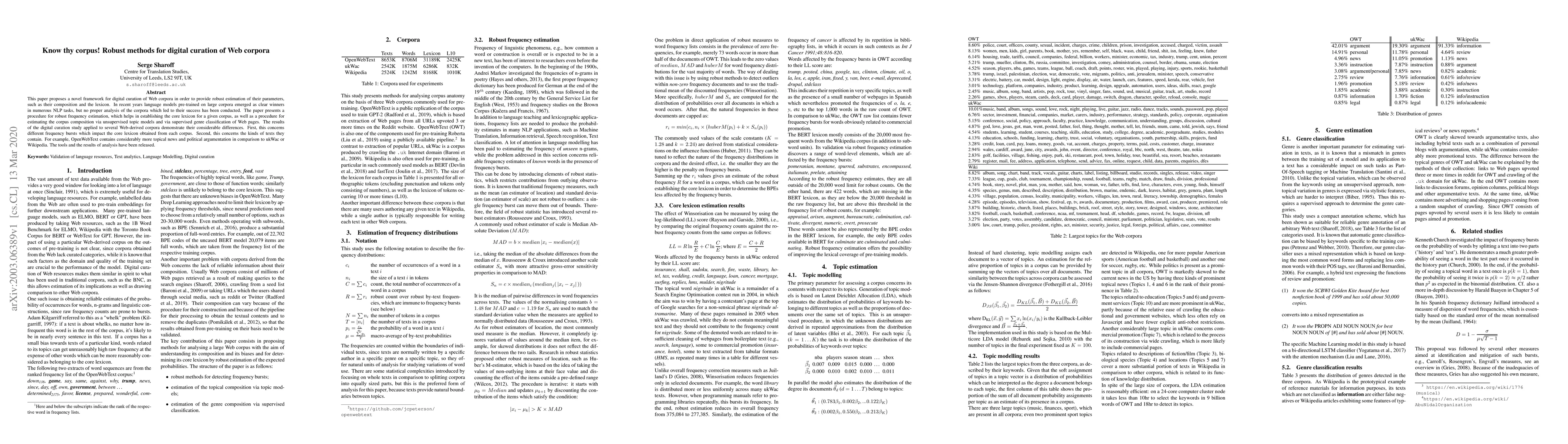 This paper introduces a framework for robust digital curation of Web corpora, focusing on parameter estimation and composition analysis. It presents methods for frequency estimation and unsupervised/supervised topic modeling, revealing significant differences in the lexicon and text composition across various Web-derived corpora.