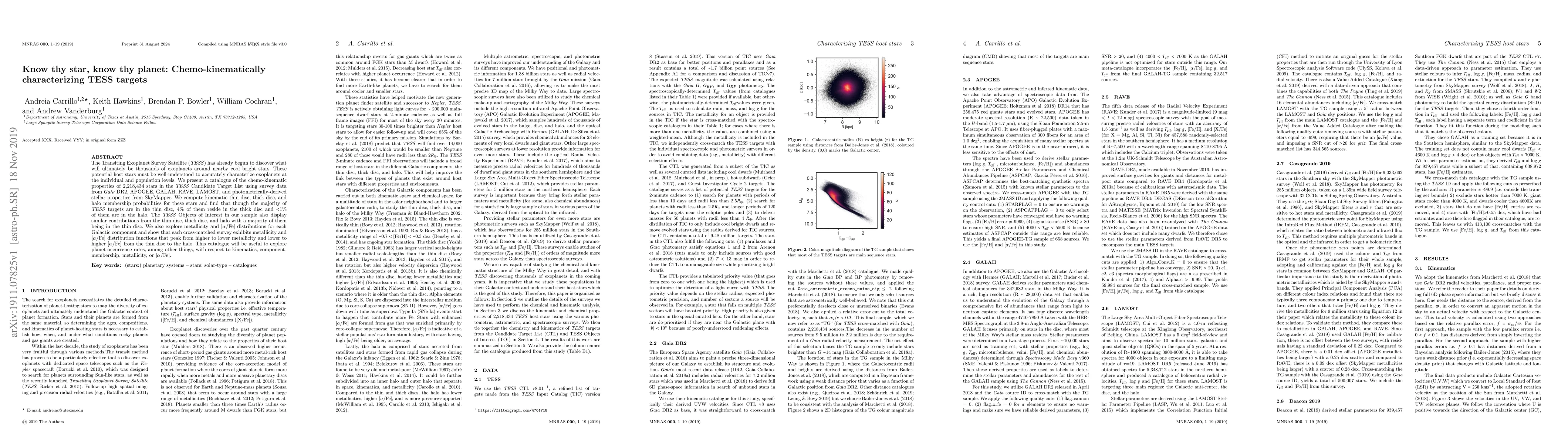 This research presents a catalogue of 2,218,434 TESS target stars' chemo-kinematic properties using data from Gaia DR2, APOGEE, GALAH, RAVE, LAMOST, and SkyMapper. The study finds that most TESS targets belong to the thin disc, with 4% in the thick disc and less than 1% in the halo. The TESS Objects of Interest show similar distribution. Metallicity and [alpha/Fe] distributions peak higher and lower, respectively, in older (thick disc/halo) populations compared to younger (thin disc) ones.