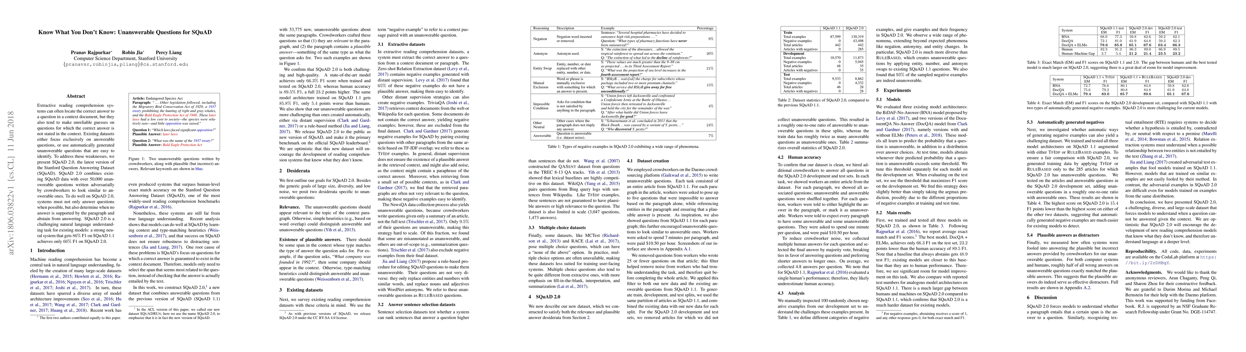 SQuAD 2.0 introduces adversarially crafted unanswerable questions to the Stanford Question Answering Dataset, challenging systems to discern when an answer is not supported by the text and to abstain from guessing. Existing models, despite high performance on SQuAD 1.1, show significant drops in performance on this new dataset.