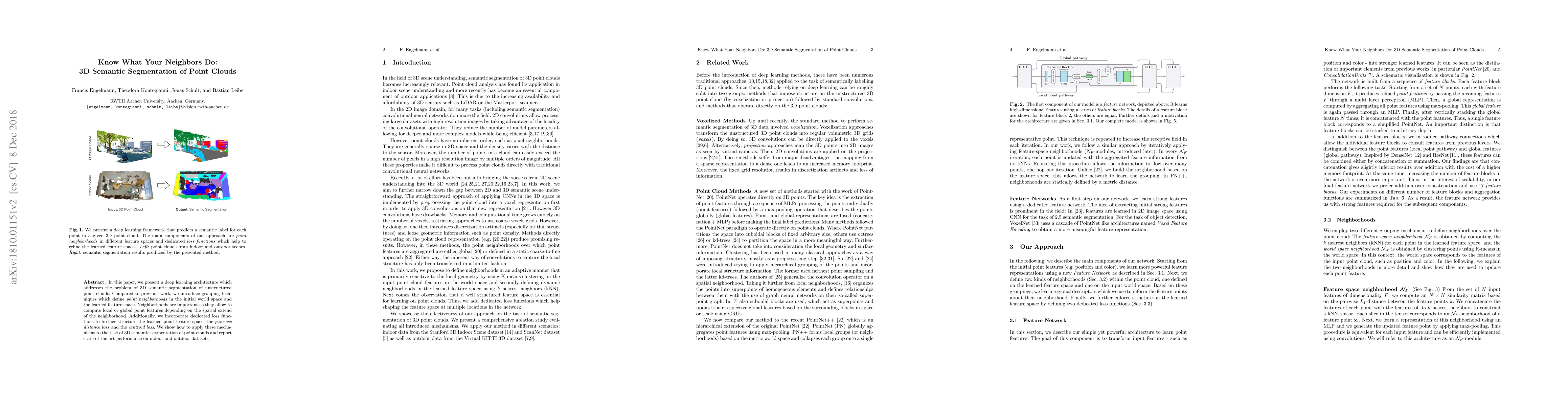 In this paper, we present a deep learning architecture which addresses the problem of 3D semantic segmentation of unstructured point clouds. Compared to previous work, we introduce grouping techniques which define point neighborhoods in the initial world space and the learned feature space. Neighborhoods are important as they allow to compute local or global point features depending on the spatial extend of the neighborhood. Additionally, we incorporate dedicated loss functions to further structure the learned point feature space: the pairwise distance loss and the centroid loss. We show how to apply these mechanisms to the task of 3D semantic segmentation of point clouds and report state-of-the-art performance on indoor and outdoor datasets.