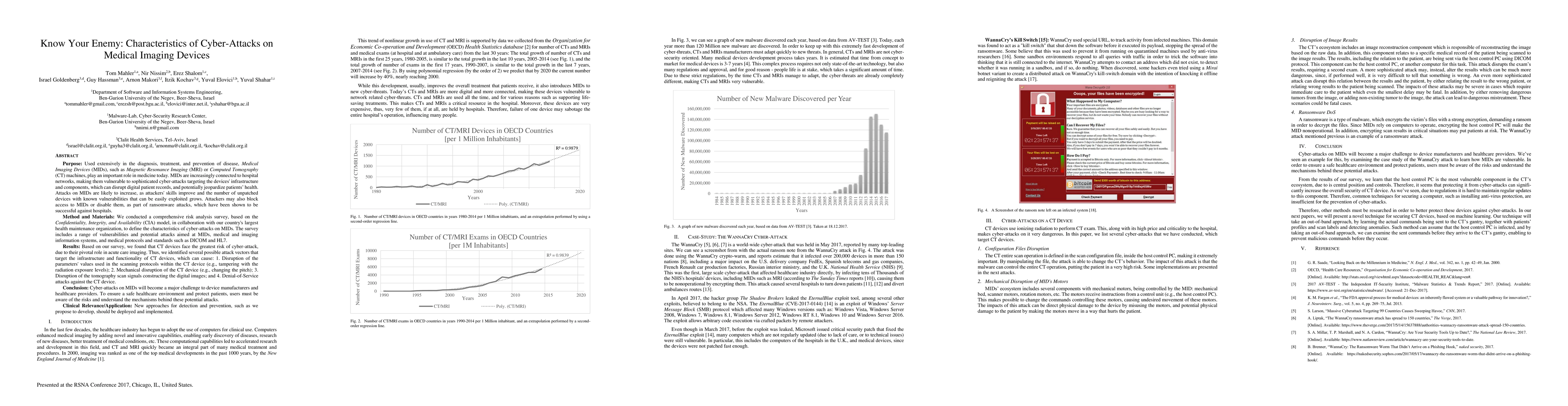 Purpose: Used extensively in the diagnosis, treatment, and prevention of disease, Medical Imaging Devices (MIDs), such as Magnetic Resonance Imaging (MRI) or Computed Tomography (CT) machines, play an important role in medicine today. MIDs are increasingly connected to hospital networks, making them vulnerable to sophisticated cyber-attacks targeting the devices' infrastructure and components, which can disrupt digital patient records, and potentially jeopardize patients' health. Attacks on MIDs are likely to increase, as attackers' skills improve and the number of unpatched devices with known vulnerabilities that can be easily exploited grows. Attackers may also block access to MIDs or disable them, as part of ransomware attacks, which have been shown to be successful against hospitals. Method and Materials: We conducted a comprehensive risk analysis survey at the Malware-Lab, based on the Confidentiality, Integrity, and Availability (CIA) model, in collaboration with our country's largest health maintenance organization, to define the characteristics of cyber-attacks on MIDs. The survey includes a range of vulnerabilities and potential attacks aimed at MIDs, medical and imaging information systems, and medical protocols and standards such as DICOM and HL7. Results: Based on our survey, we found that CT devices face the greatest risk of cyber-attack, due to their pivotal role in acute care imaging. Thus, we identified several possible attack vectors that target the infrastructure and functionality of CT devices, which can cause: 1. Disruption of the parameters' values used in the scanning protocols within the CT devices (e.g., tampering with the radiation exposure levels); 2. Mechanical disruption of the CT device (e.g., changing the pitch); 3. Disruption of the tomography scan signals constructing the digital images; and 4. Denial-of-Service attacks against the CT device.