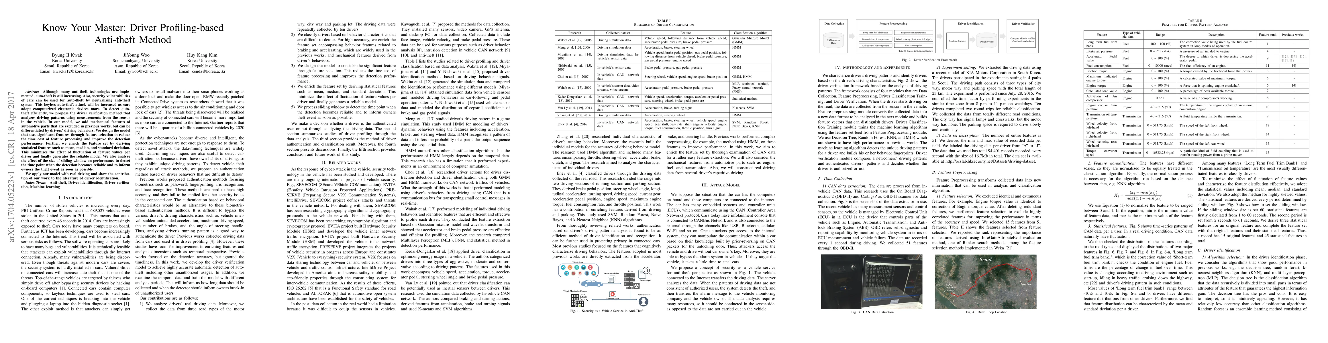 Although many anti-theft technologies are implemented, auto-theft is still increasing. Also, security vulnerabilities of cars can be used for auto-theft by neutralizing anti-theft system. This keyless auto-theft attack will be increased as cars adopt computerized electronic devices more. To detect auto-theft efficiently, we propose the driver verification method that analyzes driving patterns using measurements from the sensor in the vehicle. In our model, we add mechanical features of automotive parts that are excluded in previous works, but can be differentiated by drivers' driving behaviors. We design the model that uses significant features through feature selection to reduce the time cost of feature processing and improve the detection performance. Further, we enrich the feature set by deriving statistical features such as mean, median, and standard deviation. This minimizes the effect of fluctuation of feature values per driver and finally generates the reliable model. We also analyze the effect of the size of sliding window on performance to detect the time point when the detection becomes reliable and to inform owners the theft event as soon as possible. We apply our model with real driving and show the contribution of our work to the literature of driver identification.