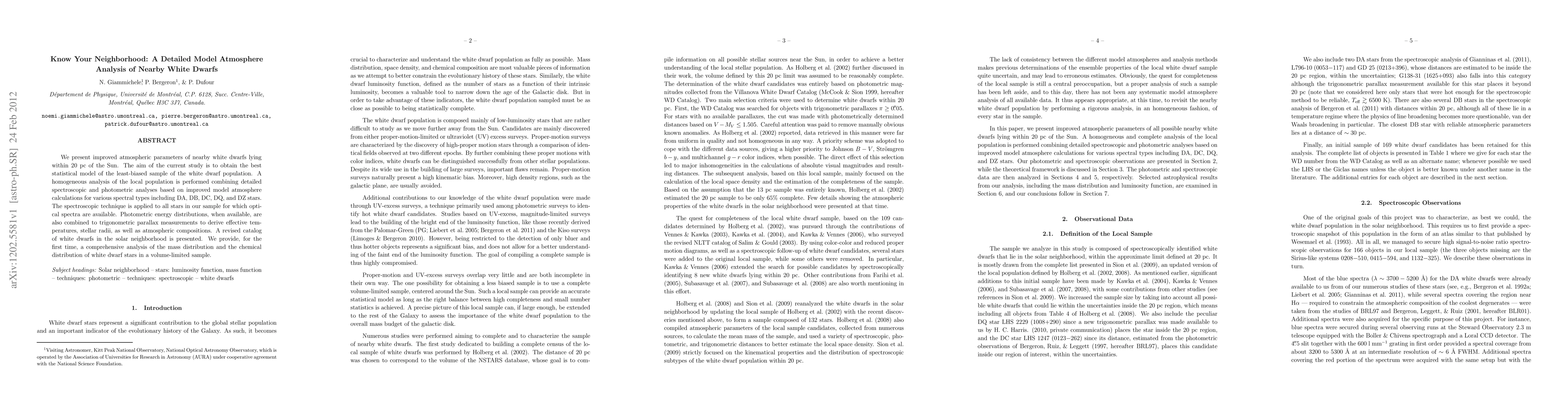 This paper presents improved atmospheric parameters for nearby white dwarfs within 20 pc of the Sun, using a comprehensive model atmosphere analysis combining spectroscopic and photometric data. It provides a revised catalog and the first detailed analysis of mass and chemical distribution in a volume-limited sample of white dwarfs.
