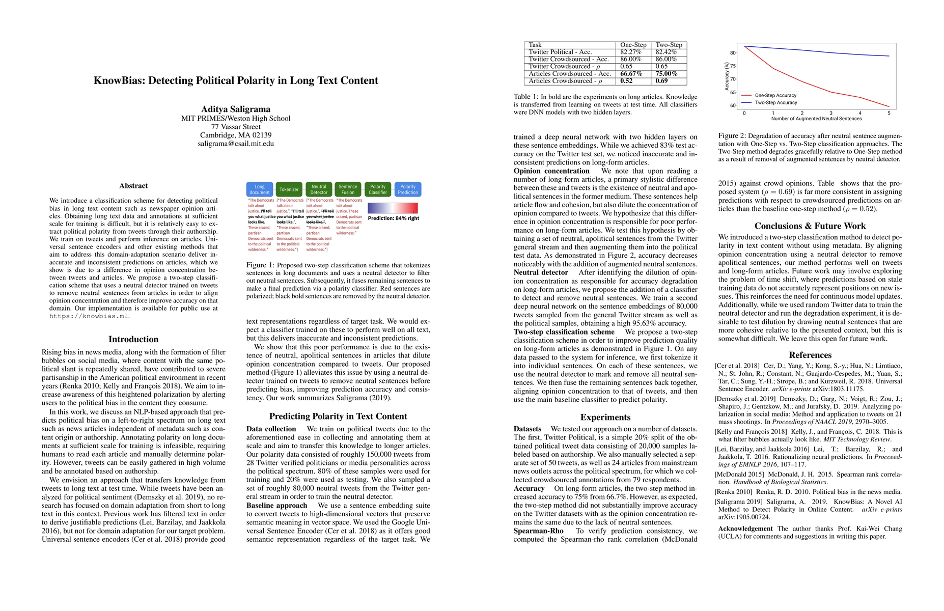 This research introduces KnowBias, a method to detect political bias in lengthy text like opinion articles. It addresses the challenge of limited annotated long text data by training on politically polarized tweets and using a two-step classification scheme. KnowBias first identifies and removes neutral sentences from articles, improving prediction accuracy by aligning opinion concentration between tweets and articles. The tool is publicly accessible at https://knowbias.ml.