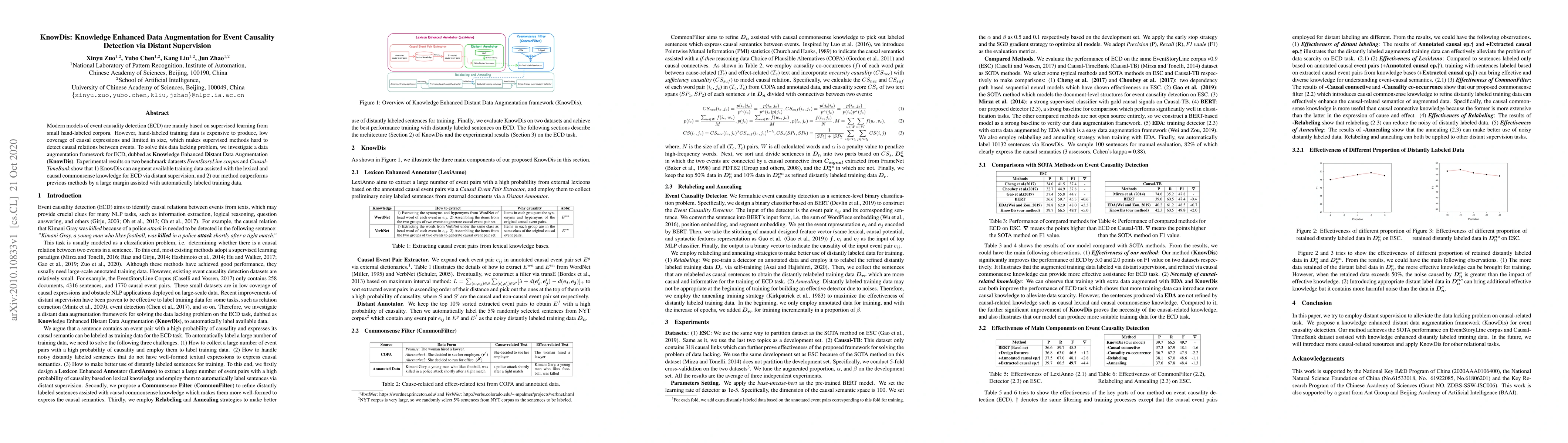 KnowDis enhances event causality detection (ECD) through a data augmentation framework leveraging lexical and causal commonsense knowledge. Experimental results show KnowDis significantly outperforms previous methods by augmenting training data via distant supervision.