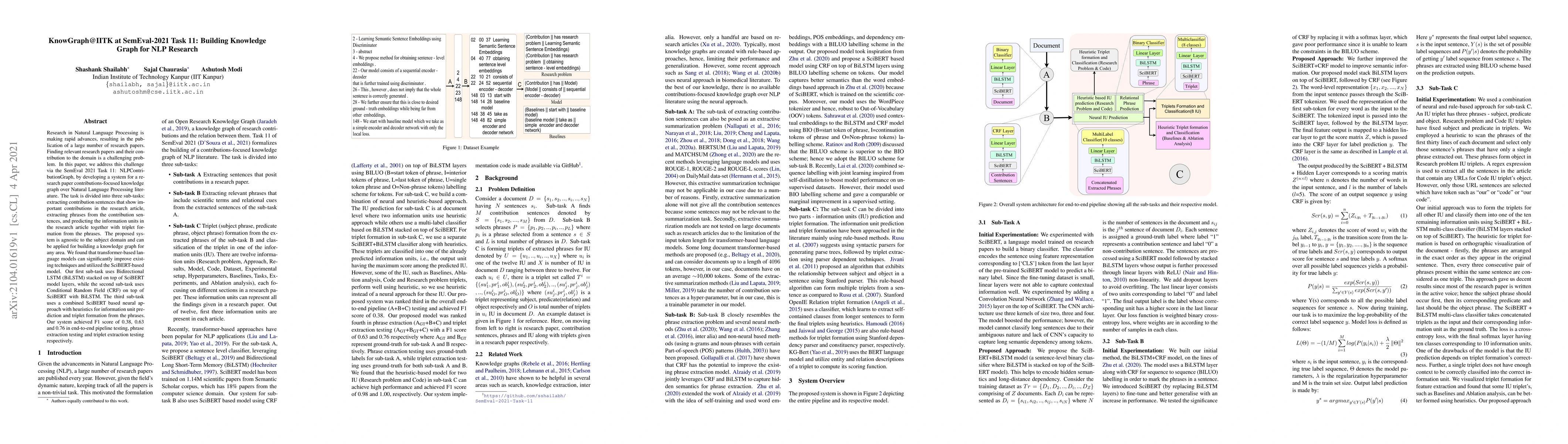 Research in Natural Language Processing is making rapid advances, resulting in the publication of a large number of research papers. Finding relevant research papers and their contribution to the domain is a challenging problem. In this paper, we address this challenge via the SemEval 2021 Task 11: NLPContributionGraph, by developing a system for a research paper contributions-focused knowledge graph over Natural Language Processing literature. The task is divided into three sub-tasks: extracting contribution sentences that show important contributions in the research article, extracting phrases from the contribution sentences, and predicting the information units in the research article together with triplet formation from the phrases. The proposed system is agnostic to the subject domain and can be applied for building a knowledge graph for any area. We found that transformer-based language models can significantly improve existing techniques and utilized the SciBERT-based model. Our first sub-task uses Bidirectional LSTM (BiLSTM) stacked on top of SciBERT model layers, while the second sub-task uses Conditional Random Field (CRF) on top of SciBERT with BiLSTM. The third sub-task uses a combined SciBERT based neural approach with heuristics for information unit prediction and triplet formation from the phrases. Our system achieved F1 score of 0.38, 0.63 and 0.76 in end-to-end pipeline testing, phrase extraction testing and triplet extraction testing respectively.
