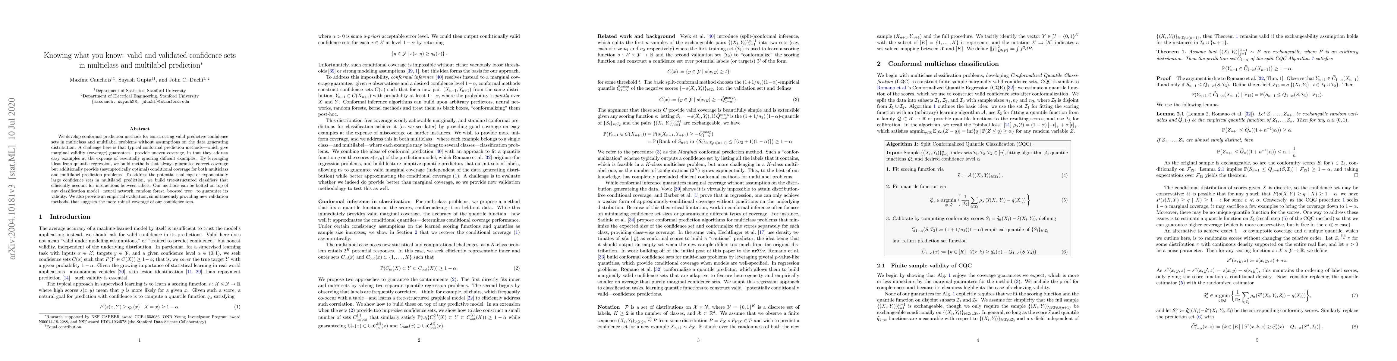 We develop conformal prediction methods for constructing valid predictive confidence sets in multiclass and multilabel problems without assumptions on the data generating distribution. A challenge here is that typical conformal prediction methods---which give marginal validity (coverage) guarantees---provide uneven coverage, in that they address easy examples at the expense of essentially ignoring difficult examples. By leveraging ideas from quantile regression, we build methods that always guarantee correct coverage but additionally provide (asymptotically optimal) conditional coverage for both multiclass and multilabel prediction problems. To address the potential challenge of exponentially large confidence sets in multilabel prediction, we build tree-structured classifiers that efficiently account for interactions between labels. Our methods can be bolted on top of any classification model---neural network, random forest, boosted tree---to guarantee its validity. We also provide an empirical evaluation, simultaneously providing new validation methods, that suggests the more robust coverage of our confidence sets.