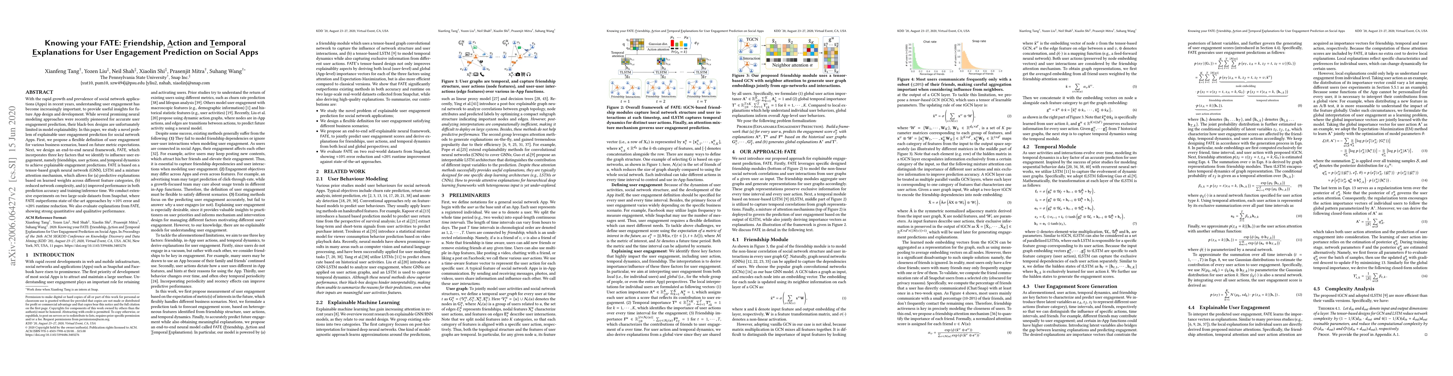 With the rapid growth and prevalence of social network applications (Apps) in recent years, understanding user engagement has become increasingly important, to provide useful insights for future App design and development. While several promising neural modeling approaches were recently pioneered for accurate user engagement prediction, their black-box designs are unfortunately limited in model explainability. In this paper, we study a novel problem of explainable user engagement prediction for social network Apps. First, we propose a flexible definition of user engagement for various business scenarios, based on future metric expectations. Next, we design an end-to-end neural framework, FATE, which incorporates three key factors that we identify to influence user engagement, namely friendships, user actions, and temporal dynamics to achieve explainable engagement predictions. FATE is based on a tensor-based graph neural network (GNN), LSTM and a mixture attention mechanism, which allows for (a) predictive explanations based on learned weights across different feature categories, (b) reduced network complexity, and (c) improved performance in both prediction accuracy and training/inference time. We conduct extensive experiments on two large-scale datasets from Snapchat, where FATE outperforms state-of-the-art approaches by ${\approx}10\%$ error and ${\approx}20\%$ runtime reduction. We also evaluate explanations from FATE, showing strong quantitative and qualitative performance.