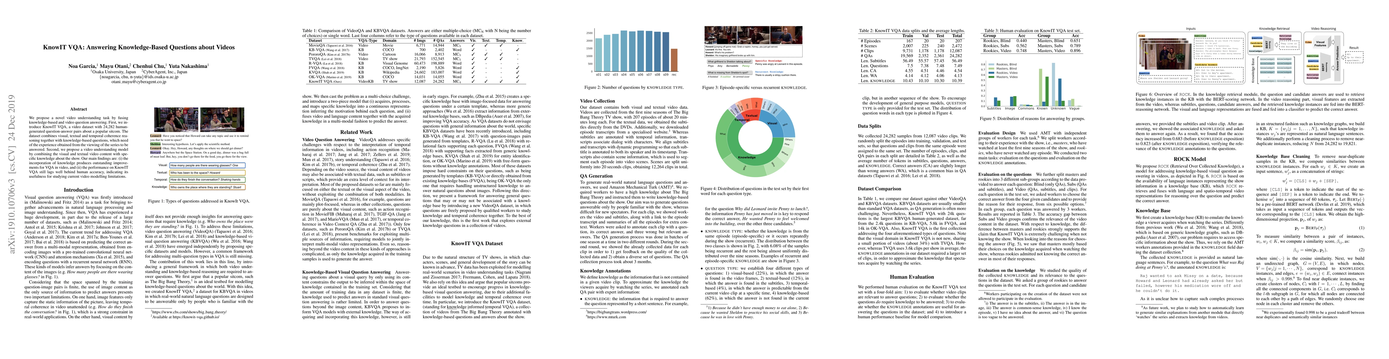This paper introduces KnowIT VQA, a new dataset for knowledge-based video question answering that combines visual, textual, and temporal reasoning. The authors propose a model that integrates visual and textual content with knowledge about the show, showing significant improvements over traditional methods, though still falling short of human accuracy.