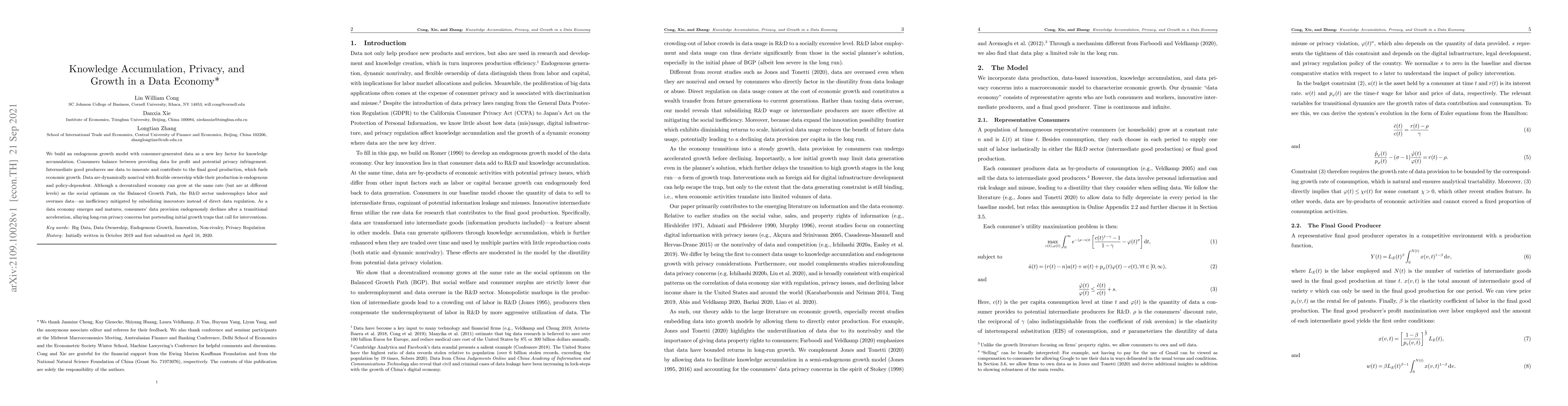 We build an endogenous growth model with consumer-generated data as a new key factor for knowledge accumulation. Consumers balance between providing data for profit and potential privacy infringement. Intermediate good producers use data to innovate and contribute to the final good production, which fuels economic growth. Data are dynamically nonrival with flexible ownership while their production is endogenous and policy-dependent. Although a decentralized economy can grow at the same rate (but are at different levels) as the social optimum on the Balanced Growth Path, the R&D sector underemploys labor and overuses data -- an inefficiency mitigated by subsidizing innovators instead of direct data regulation. As a data economy emerges and matures, consumers' data provision endogenously declines after a transitional acceleration, allaying long-run privacy concerns but portending initial growth traps that call for interventions.