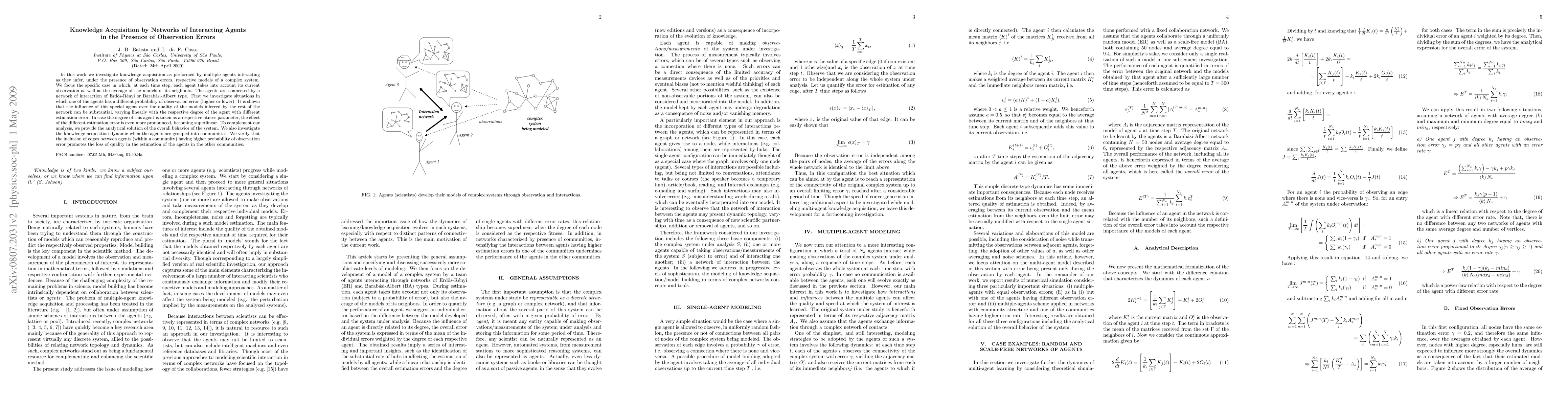 In this work we investigate knowledge acquisition as performed by multiple agents interacting as they infer, under the presence of observation errors, respective models of a complex system. We focus the specific case in which, at each time step, each agent takes into account its current observation as well as the average of the models of its neighbors. The agents are connected by a network of interaction of Erd\H{o}s-Renyi or Barabasi-Albert type. First we investigate situations in which one of the agents has a different probability of observation error (higher or lower). It is shown that the influence of this special agent over the quality of the models inferred by the rest of the network can be substantial, varying linearly with the respective degree of the agent with different estimation error. In case the degree of this agent is taken as a respective fitness parameter, the effect of the different estimation error is even more pronounced, becoming superlinear. To complement our analysis, we provide the analytical solution of the overall behavior of the system. We also investigate the knowledge acquisition dynamic when the agents are grouped into communities. We verify that the inclusion of edges between agents (within a community) having higher probability of observation error promotes the loss of quality in the estimation of the agents in the other communities.
