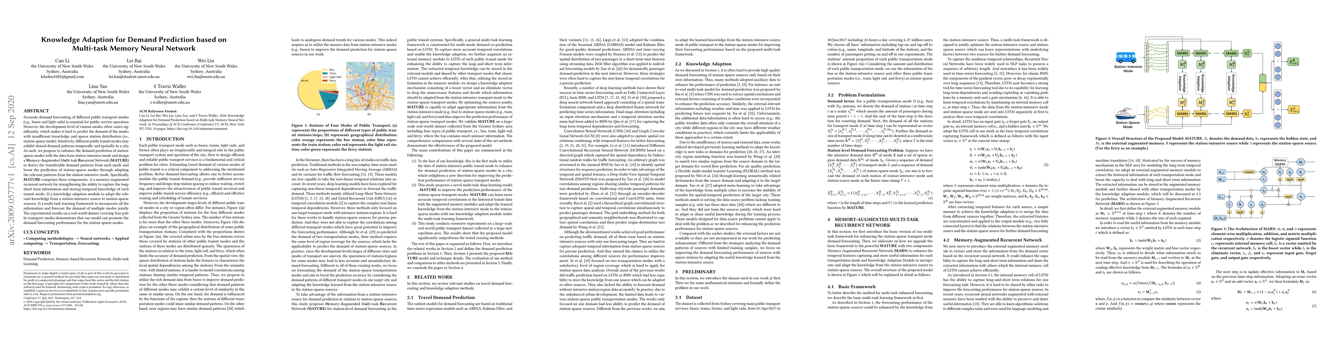 Accurate demand forecasting of different public transport modes(e.g., buses and light rails) is essential for public service operation.However, the development level of various modes often varies sig-nificantly, which makes it hard to predict the demand of the modeswith insufficient knowledge and sparse station distribution (i.e.,station-sparse mode). Intuitively, different public transit modes mayexhibit shared demand patterns temporally and spatially in a city.As such, we propose to enhance the demand prediction of station-sparse modes with the data from station-intensive mode and designaMemory-Augmented Multi-taskRecurrent Network (MATURE)to derive the transferable demand patterns from each mode andboost the prediction of station-sparse modes through adaptingthe relevant patterns from the station-intensive mode. Specifically,MATUREcomprises three components: 1) a memory-augmentedrecurrent network for strengthening the ability to capture the long-short term information and storing temporal knowledge of eachtransit mode; 2) a knowledge adaption module to adapt the rele-vant knowledge from a station-intensive source to station-sparsesources; 3) a multi-task learning framework to incorporate all theinformation and forecast the demand of multiple modes jointly.The experimental results on a real-world dataset covering four pub-lic transport modes demonstrate that our model can promote thedemand forecasting performance for the station-sparse modes.