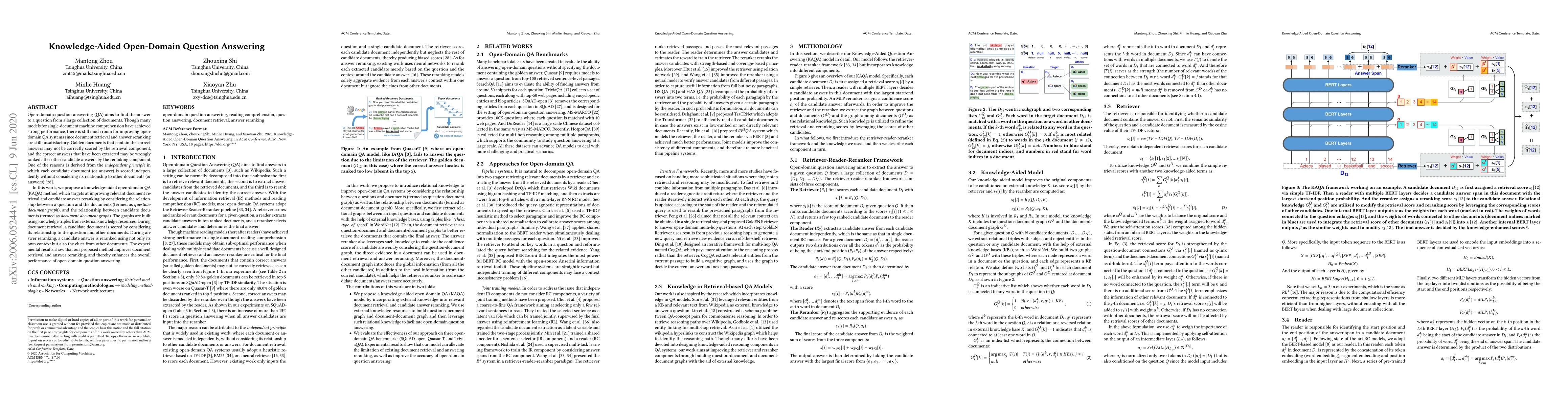 This paper proposes a knowledge-aided open-domain QA method that leverages external knowledge triples to build question-document and document-document graphs, improving both document retrieval and answer reranking by considering inter-document relationships. Experimental results show enhanced overall performance in open-domain question answering.