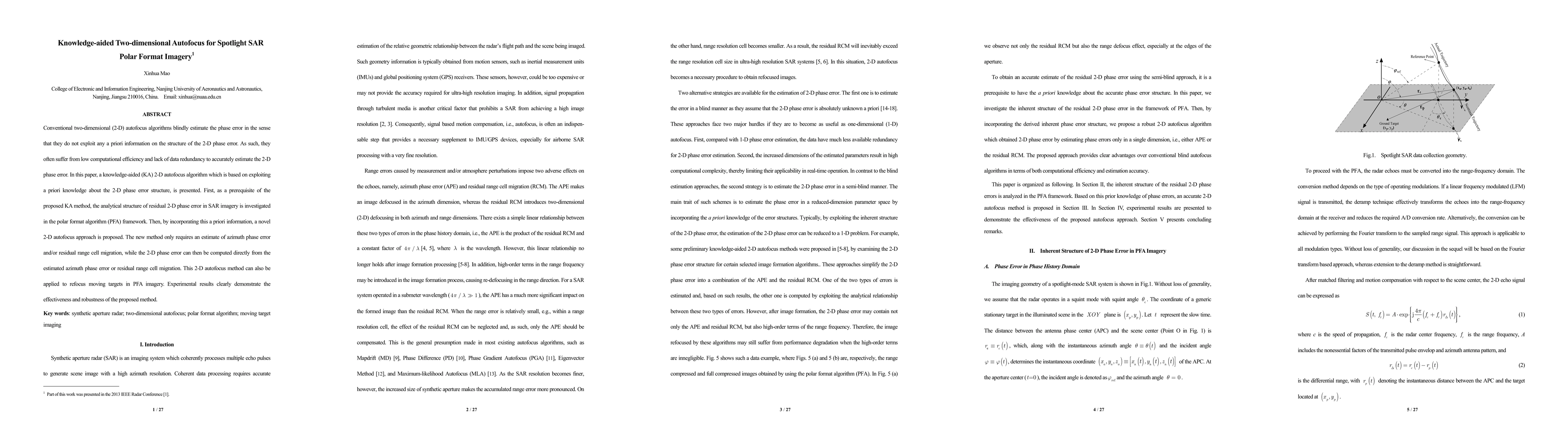 This paper introduces a knowledge-aided two-dimensional autofocus algorithm for Spotlight SAR Polar Format Imagery that leverages a priori information about the 2-D phase error structure, improving computational efficiency and accuracy compared to conventional methods. The proposed method estimates azimuth phase error or residual range cell migration to directly compute the 2-D phase error, demonstrating effectiveness in refocusing moving targets.