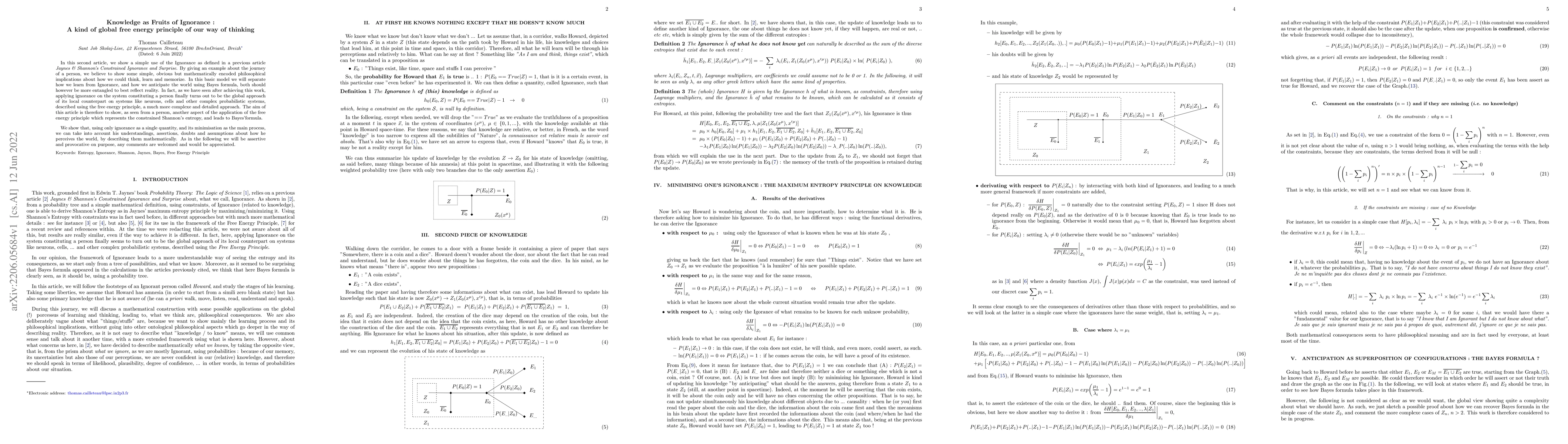 In this second article, we show a simple use of the Ignorance as defined in "Jaynes & Shannon's Constrained Ignorance and Surprise". By giving an example about the journey of a person, we believe to show some simple, obvious but mathematically encoded philosophical implications about how we could think, learn and memorize. In this basic model we will separate how we learn from Ignorance, and how we anticipate the world using Bayes formula, both should however be more entangled to best reflect reality. In fact, as we have seen after achieving this work, applying Ignorance on the system constituting a person finally turns out to be the global approach of its local counterpart on systems like neurons, cells and other complex probabilistic systems, described using the free energy principle, a much more complex and detailed approach. The aim of this article is therefore to show, as seen from a person, another aspect of the application of the free energy principle which represents the constrained Shannon's entropy, and leads to Bayes'formula. We show that, using only ignorance as a single quantity, and its minimization as the main process, we can take into account his understandings, assertions, doubts and assumptions about how he perceives the world, by describing them mathematically.