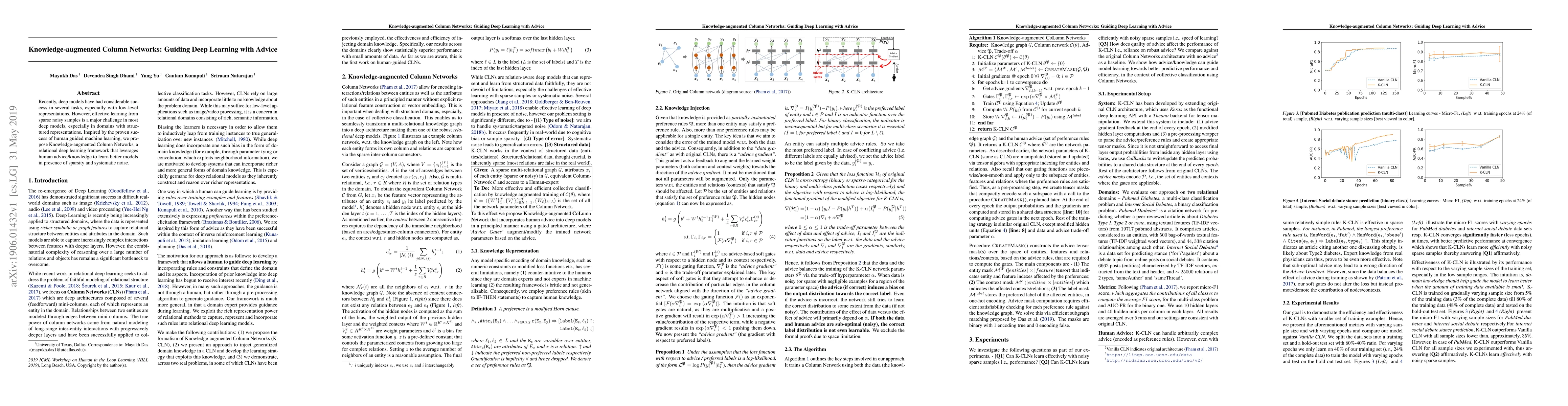 Summary: This paper introduces Knowledge-augmented Column Networks, a relational deep learning framework that uses human-provided advice to enhance model learning, particularly in scenarios with sparse and noisy data, aiming to improve performance in structured representation domains.