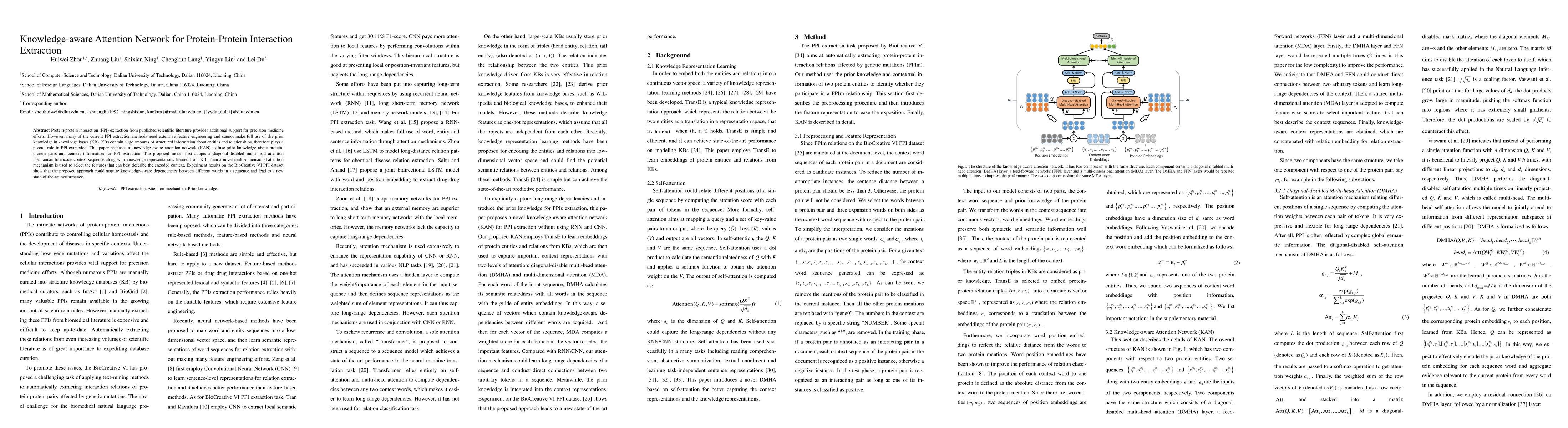 This paper proposes a knowledge-aware attention network (KAN) to enhance protein-protein interaction extraction by integrating prior knowledge from knowledge bases with context information. The model employs a diagonal-disabled multi-head attention mechanism and a multi-dimensional attention mechanism to achieve state-of-the-art performance on the BioCreative VI PPI dataset.