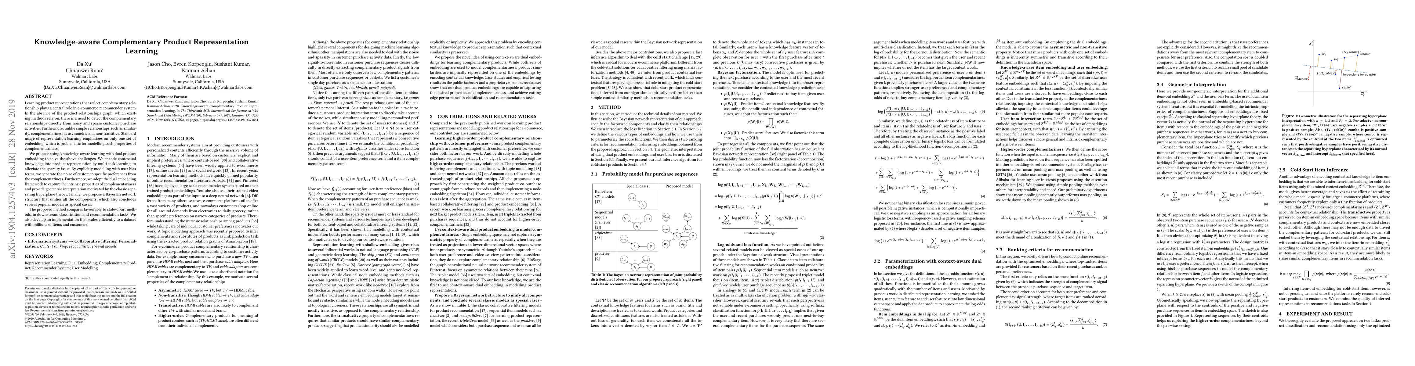 This research paper proposes a new method to learn product representations that reflect complementary relationships in e-commerce recommender systems, addressing the challenges of noisy and sparse customer purchase data and asymmetric complementariness.
