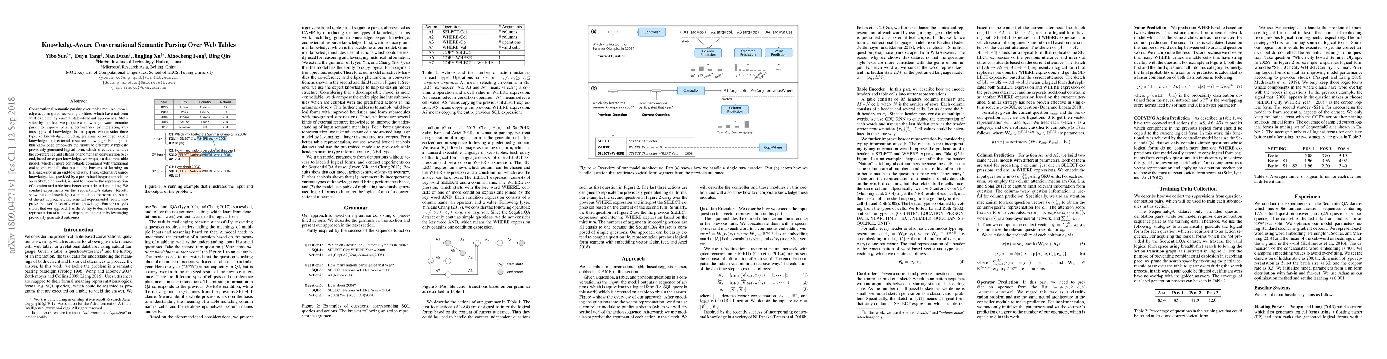 This paper proposes a knowledge-aware semantic parser to enhance conversational parsing over web tables by integrating grammar, expert, and external resource knowledge. Experimental results show that the model outperforms existing methods, demonstrating the effectiveness of leveraging various types of knowledge.