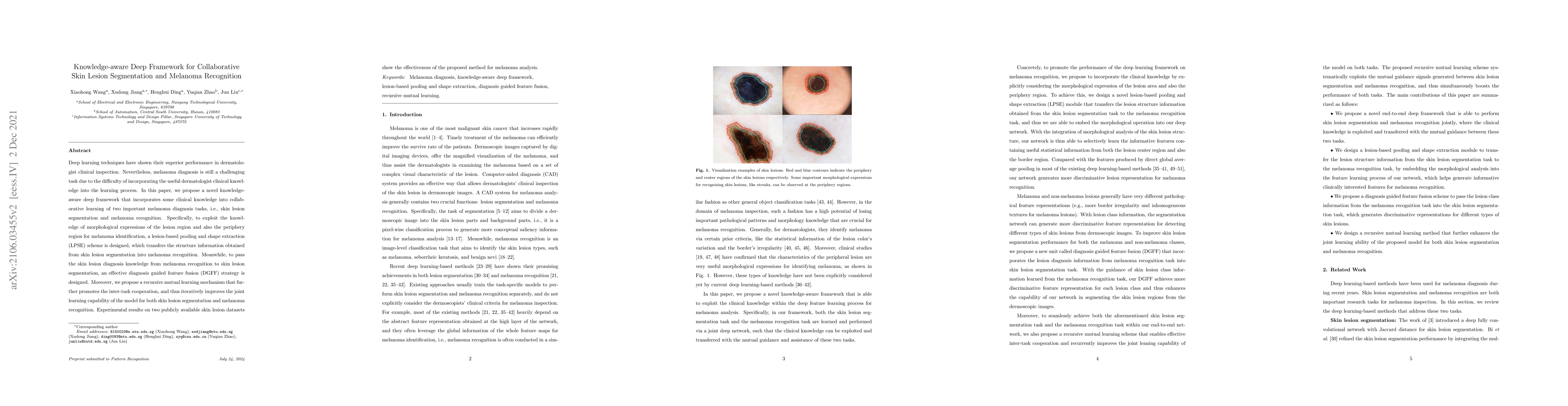 This paper introduces a knowledge-aware deep framework that integrates dermatologist clinical knowledge to enhance collaborative learning for skin lesion segmentation and melanoma recognition. The proposed framework includes a lesion-based pooling and shape extraction scheme and a diagnosis-guided feature fusion strategy to improve inter-task cooperation and iteratively refine the model's performance.