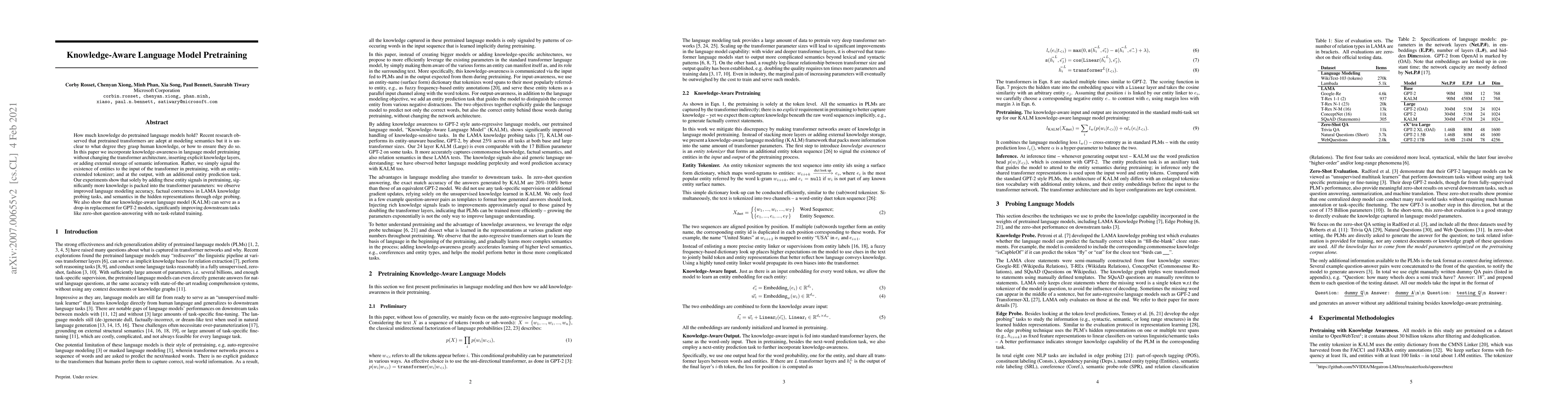 This paper introduces a knowledge-aware language model pretraining method that enhances pretrained transformers by incorporating entity signals during training without altering the architecture or adding external knowledge storage. The approach improves language modeling accuracy and factual correctness, demonstrating that knowledge can be embedded directly into transformer parameters.