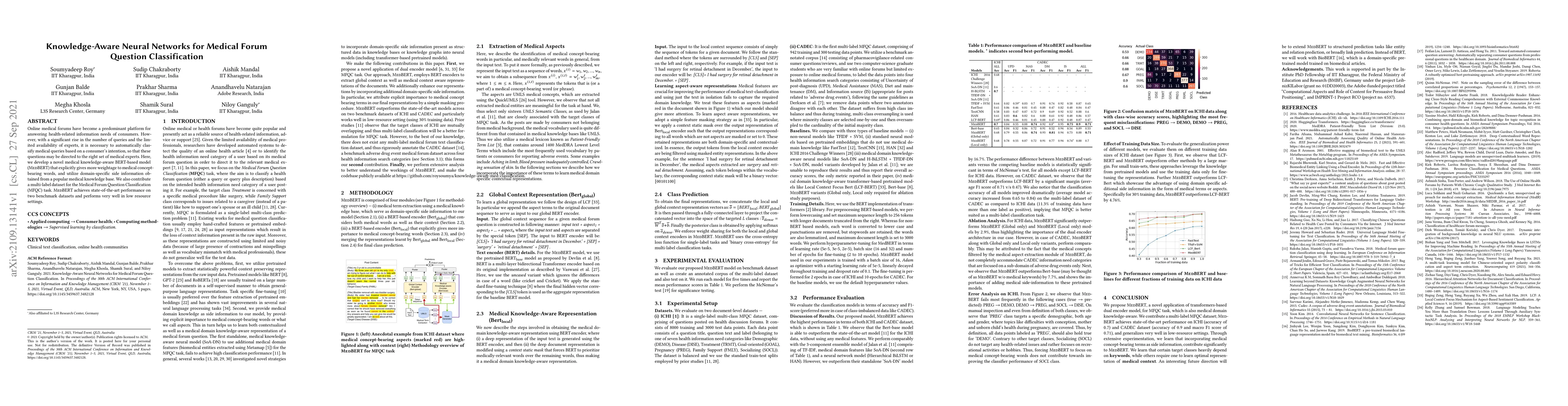 Online medical forums have become a predominant platform for answering health-related information needs of consumers. However, with a significant rise in the number of queries and the limited availability of experts, it is necessary to automatically classify medical queries based on a consumer's intention, so that these questions may be directed to the right set of medical experts. Here, we develop a novel medical knowledge-aware BERT-based model (MedBERT) that explicitly gives more weightage to medical concept-bearing words, and utilize domain-specific side information obtained from a popular medical knowledge base. We also contribute a multi-label dataset for the Medical Forum Question Classification (MFQC) task. MedBERT achieves state-of-the-art performance on two benchmark datasets and performs very well in low resource settings.