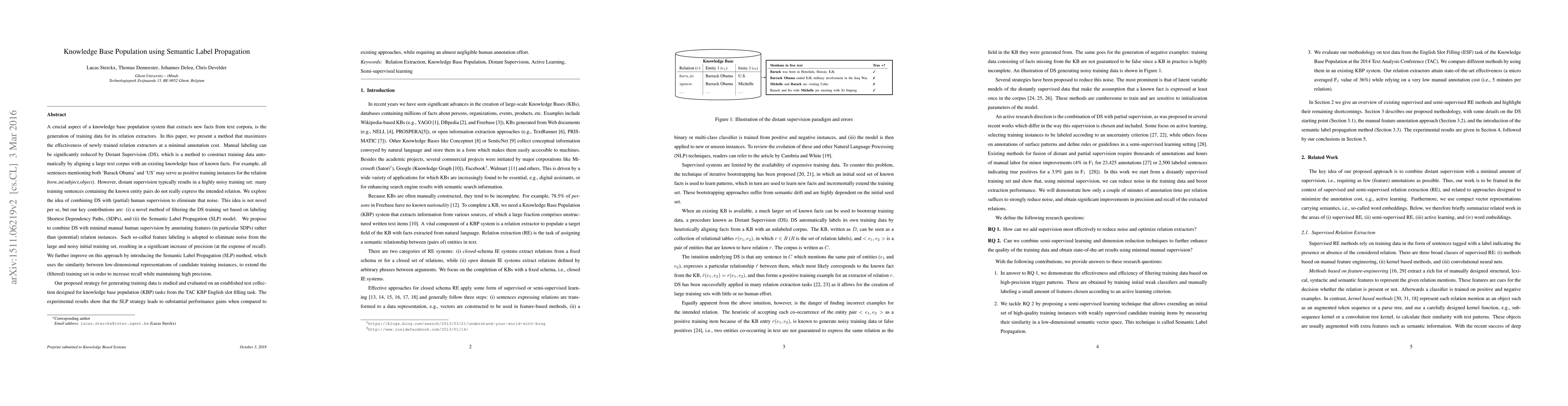 This paper proposes a method combining distant supervision and semantic label propagation to generate high-quality training data for relation extractors with minimal manual annotation, significantly improving both precision and recall in knowledge base population.