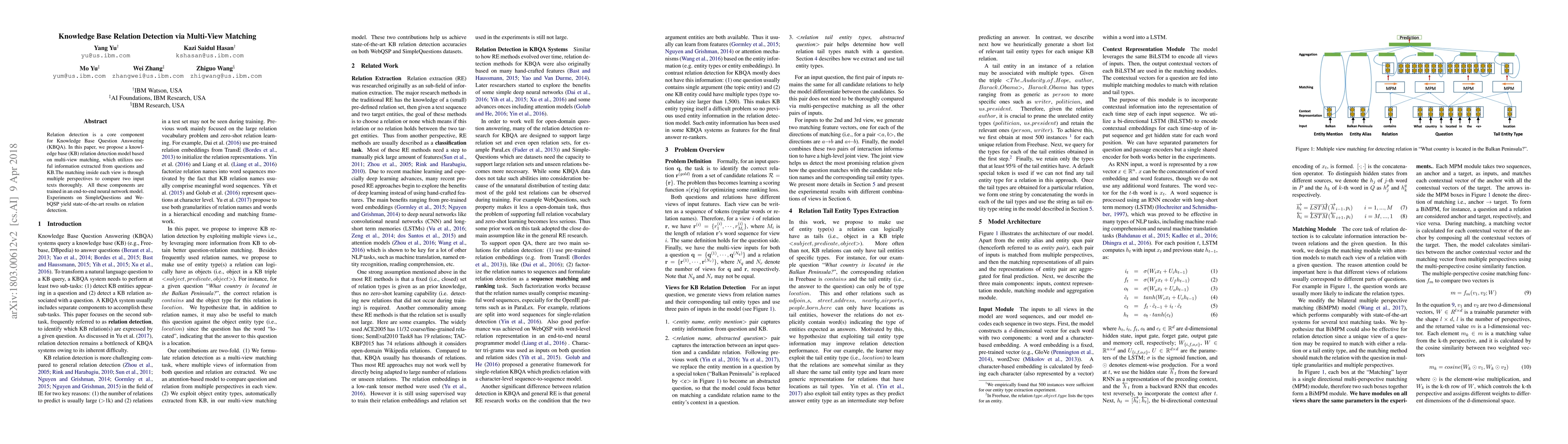 This paper proposes a multi-view matching neural network model for detecting relations in Knowledge Base Question Answering (KBQA), utilizing diverse information from questions and KBs. The model achieves state-of-the-art results on SimpleQuestions and WebQSP datasets.