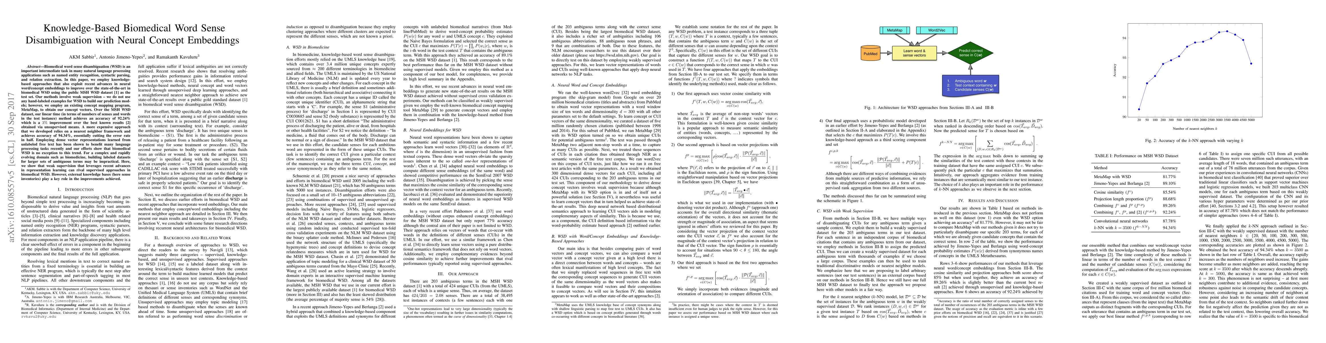 This paper presents a knowledge-based approach to biomedical word sense disambiguation (WSD) that leverages neural concept embeddings, achieving an accuracy of 92.24% on the MSH WSD dataset. The method uses weak supervision without hand-labeled examples, relying on MetaMap for concept vectors, and demonstrates a 3% improvement over previous knowledge-based methods.