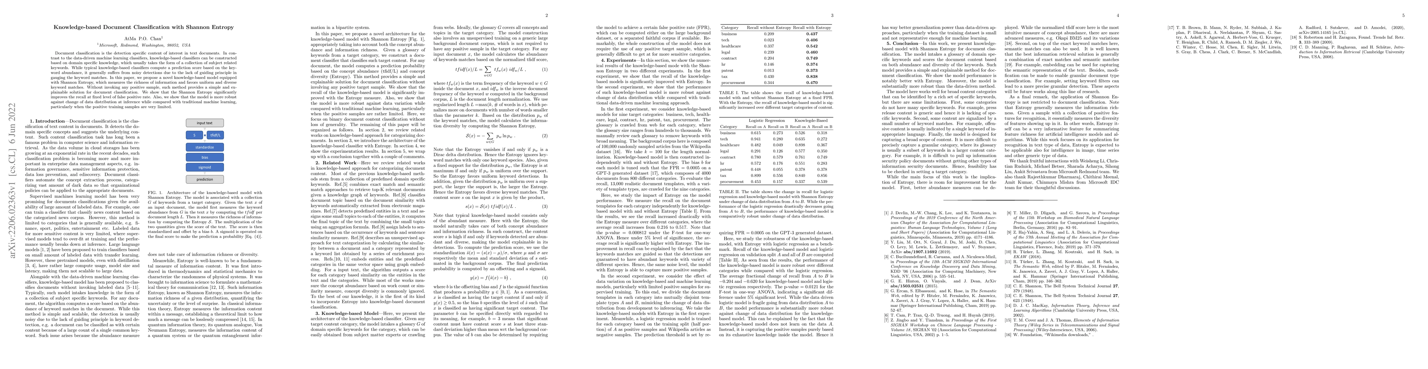 Document classification is the detection specific content of interest in text documents. In contrast to the data-driven machine learning classifiers, knowledge-based classifiers can be constructed based on domain specific knowledge, which usually takes the form of a collection of subject related keywords. While typical knowledge-based classifiers compute a prediction score based on the keyword abundance, it generally suffers from noisy detections due to the lack of guiding principle in gauging the keyword matches. In this paper, we propose a novel knowledge-based model equipped with Shannon Entropy, which measures the richness of information and favors uniform and diverse keyword matches. Without invoking any positive sample, such method provides a simple and explainable solution for document classification. We show that the Shannon Entropy significantly improves the recall at fixed level of false positive rate. Also, we show that the model is more robust against change of data distribution at inference while compared with traditional machine learning, particularly when the positive training samples are very limited.
