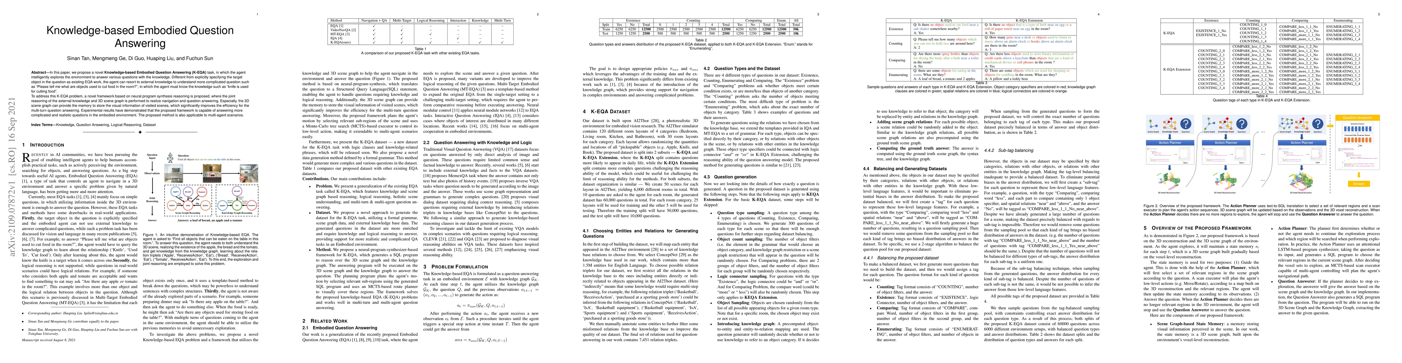 This paper introduces a Knowledge-based Embodied Question Answering (K-EQA) framework that uses neural program synthesis reasoning to combine external knowledge with a 3D scene graph for navigating and answering complex questions in an embodied environment. The method enhances efficiency for multi-turn question answering and demonstrates effectiveness in multi-agent scenarios.
