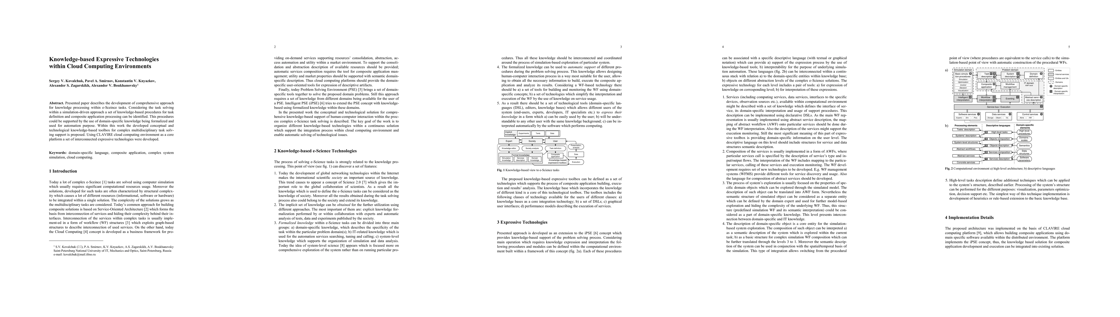 This paper proposes a comprehensive knowledge-based toolbox for e-Science tasks, utilizing domain-specific formalized knowledge to automate complex multidisciplinary problem solving within the CLAVIRE cloud computing environment. The developed technologies are designed to enhance expressive technologies for task definition and composite application processing.