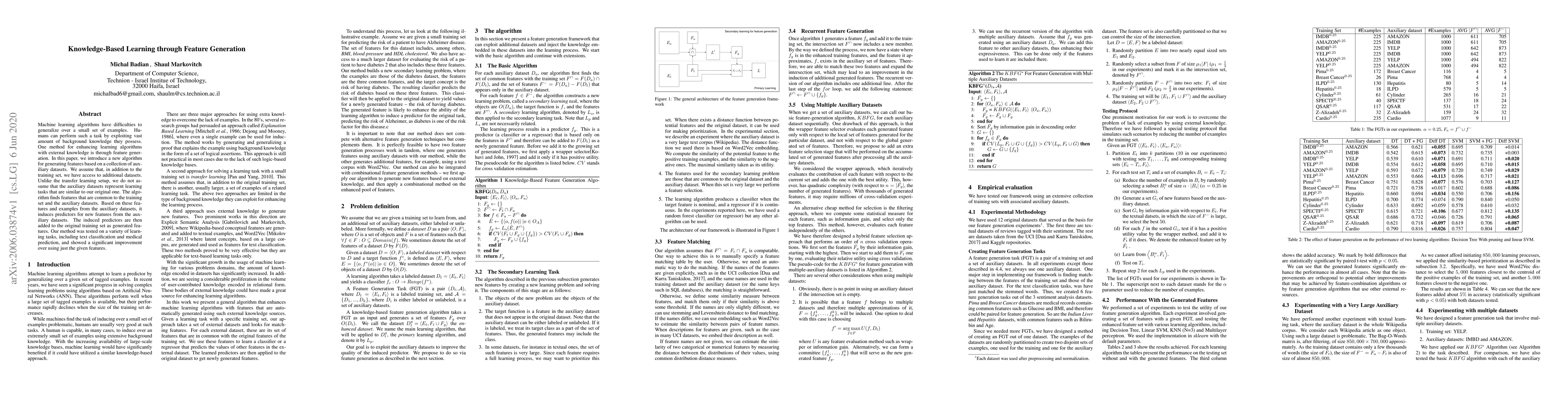 Machine learning algorithms have difficulties to generalize over a small set of examples. Humans can perform such a task by exploiting vast amount of background knowledge they possess. One method for enhancing learning algorithms with external knowledge is through feature generation. In this paper, we introduce a new algorithm for generating features based on a collection of auxiliary datasets. We assume that, in addition to the training set, we have access to additional datasets. Unlike the transfer learning setup, we do not assume that the auxiliary datasets represent learning tasks that are similar to our original one. The algorithm finds features that are common to the training set and the auxiliary datasets. Based on these features and examples from the auxiliary datasets, it induces predictors for new features from the auxiliary datasets. The induced predictors are then added to the original training set as generated features. Our method was tested on a variety of learning tasks, including text classification and medical prediction, and showed a significant improvement over using just the given features.