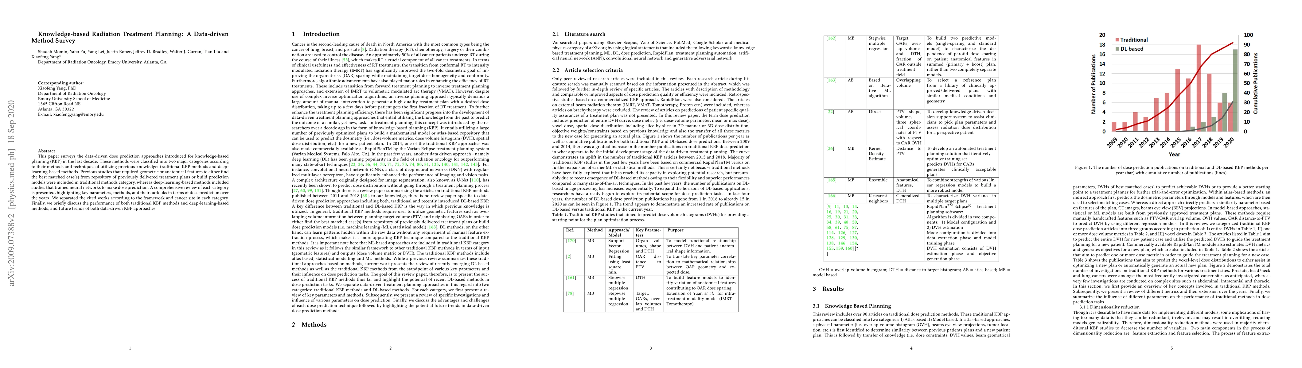 This paper surveys data-driven dose prediction approaches for radiation treatment planning, highlighting traditional methods that use geometric features and deep-learning-based methods that train neural networks to predict doses. The review provides a comprehensive overview of key parameters and future trends in knowledge-based planning.