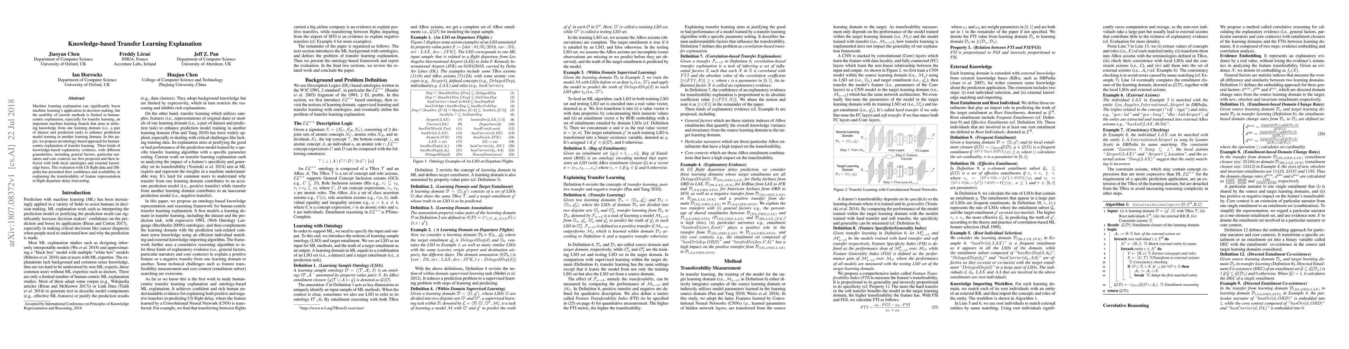 Machine learning explanation can significantly boost machine learning's application in decision making, but the usability of current methods is limited in human-centric explanation, especially for transfer learning, an important machine learning branch that aims at utilizing knowledge from one learning domain (i.e., a pair of dataset and prediction task) to enhance prediction model training in another learning domain. In this paper, we propose an ontology-based approach for human-centric explanation of transfer learning. Three kinds of knowledge-based explanatory evidence, with different granularities, including general factors, particular narrators and core contexts are first proposed and then inferred with both local ontologies and external knowledge bases. The evaluation with US flight data and DBpedia has presented their confidence and availability in explaining the transferability of feature representation in flight departure delay forecasting.