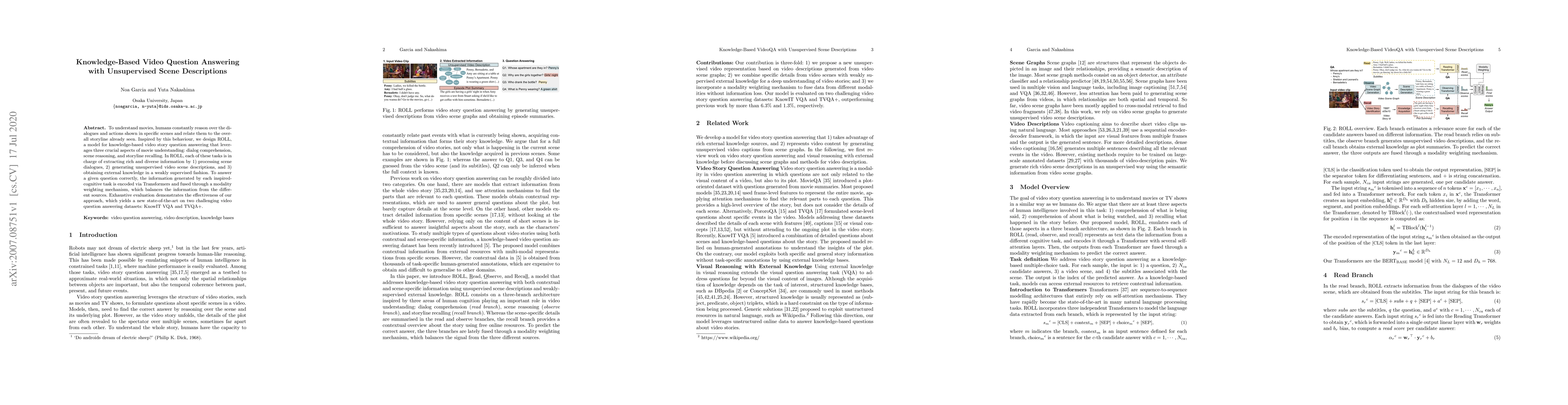 The paper introduces ROLL, a model for knowledge-based video question answering that integrates dialog comprehension, scene reasoning, and storyline recalling. ROLL leverages unsupervised scene descriptions and external knowledge to generate answers, achieving state-of-the-art results on KnowIT VQA and TVQA+ datasets.