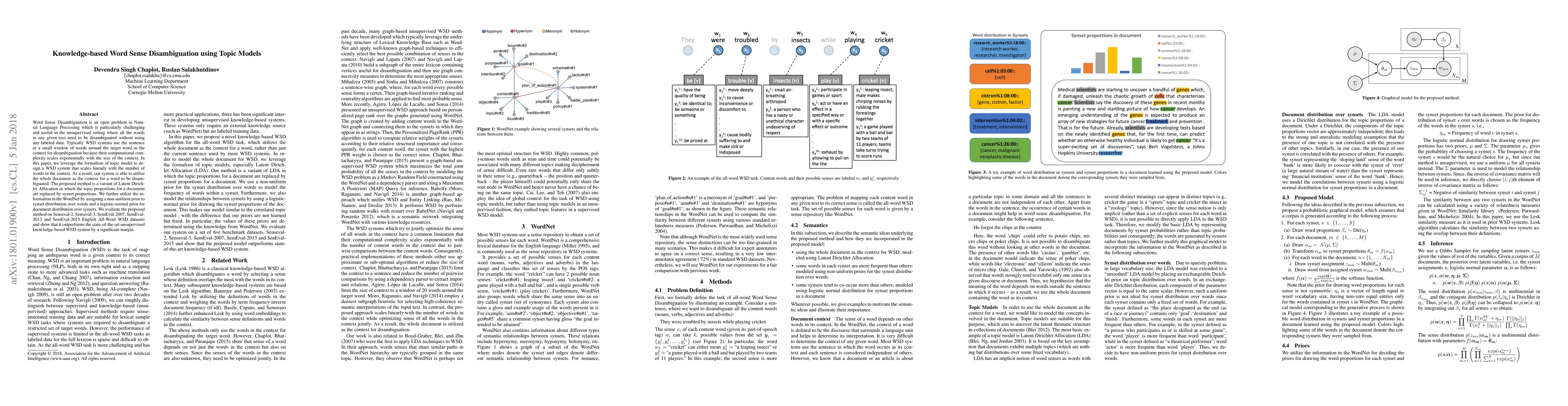 Word Sense Disambiguation is an open problem in Natural Language Processing which is particularly challenging and useful in the unsupervised setting where all the words in any given text need to be disambiguated without using any labeled data. Typically WSD systems use the sentence or a small window of words around the target word as the context for disambiguation because their computational complexity scales exponentially with the size of the context. In this paper, we leverage the formalism of topic model to design a WSD system that scales linearly with the number of words in the context. As a result, our system is able to utilize the whole document as the context for a word to be disambiguated. The proposed method is a variant of Latent Dirichlet Allocation in which the topic proportions for a document are replaced by synset proportions. We further utilize the information in the WordNet by assigning a non-uniform prior to synset distribution over words and a logistic-normal prior for document distribution over synsets. We evaluate the proposed method on Senseval-2, Senseval-3, SemEval-2007, SemEval-2013 and SemEval-2015 English All-Word WSD datasets and show that it outperforms the state-of-the-art unsupervised knowledge-based WSD system by a significant margin.