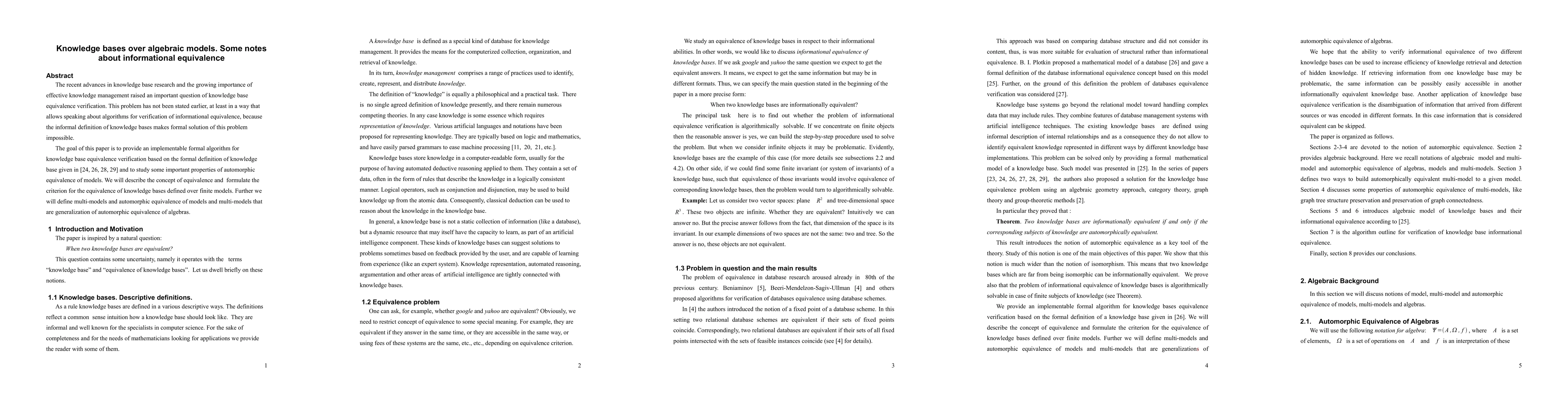 The recent advances in knowledge base research and the growing importance of effective knowledge management raised an important question of knowledge base equivalence verification. This problem has not been stated earlier, at least in a way that allows speaking about algorithms for verification of informational equivalence, because the informal definition of knowledge bases makes formal solution of this problem impossible. In this paper we provide an implementable formal algorithm for knowledge base equivalence verification based on the formal definition of knowledge base proposed by Plotkin B. and Plotkin T., and study some important properties of automorphic equivalence of models. We also describe the concept of equivalence and formulate the criterion for the equivalence of knowledge bases defined over finite models. Further we define multi-models and automorphic equivalence of models and multi-models, that is generalization of automorphic equivalence of algebras.