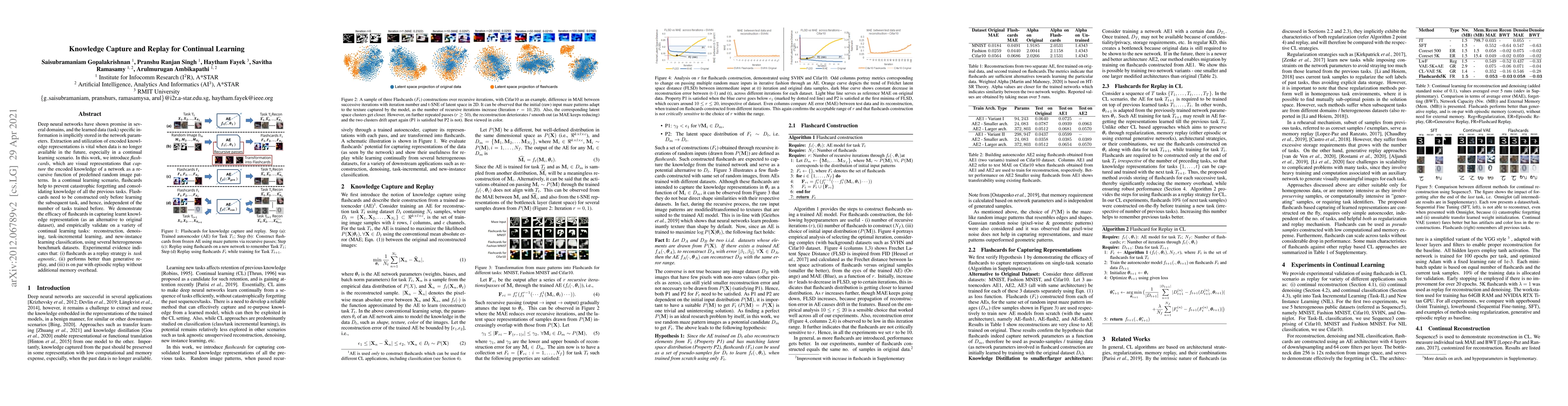 Deep neural networks have shown promise in several domains, and the learned data (task) specific information is implicitly stored in the network parameters. Extraction and utilization of encoded knowledge representations are vital when data is no longer available in the future, especially in a continual learning scenario. In this work, we introduce {\em flashcards}, which are visual representations that {\em capture} the encoded knowledge of a network as a recursive function of predefined random image patterns. In a continual learning scenario, flashcards help to prevent catastrophic forgetting and consolidating knowledge of all the previous tasks. Flashcards need to be constructed only before learning the subsequent task, and hence, independent of the number of tasks trained before. We demonstrate the efficacy of flashcards in capturing learned knowledge representation (as an alternative to the original dataset) and empirically validate on a variety of continual learning tasks: reconstruction, denoising, task-incremental learning, and new-instance learning classification, using several heterogeneous benchmark datasets. Experimental evidence indicates that: (i) flashcards as a replay strategy is { \em task agnostic}, (ii) performs better than generative replay, and (iii) is on par with episodic replay without additional memory overhead.