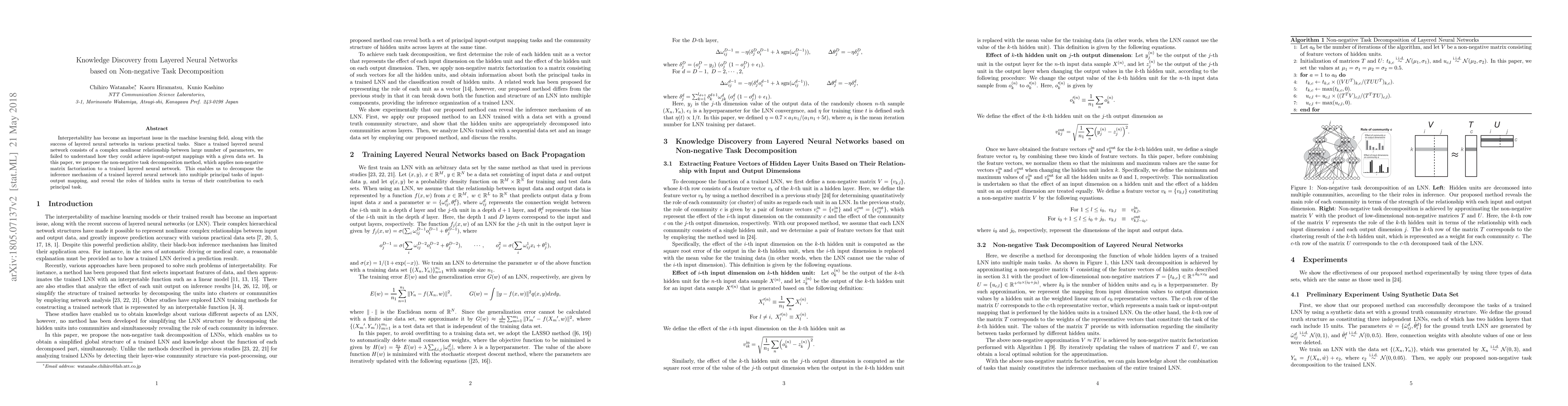 This paper proposes a non-negative task decomposition method using non-negative matrix factorization to interpret layered neural networks by breaking down their inference mechanisms into principal input-output mapping tasks, thereby revealing the roles of hidden units in these tasks.