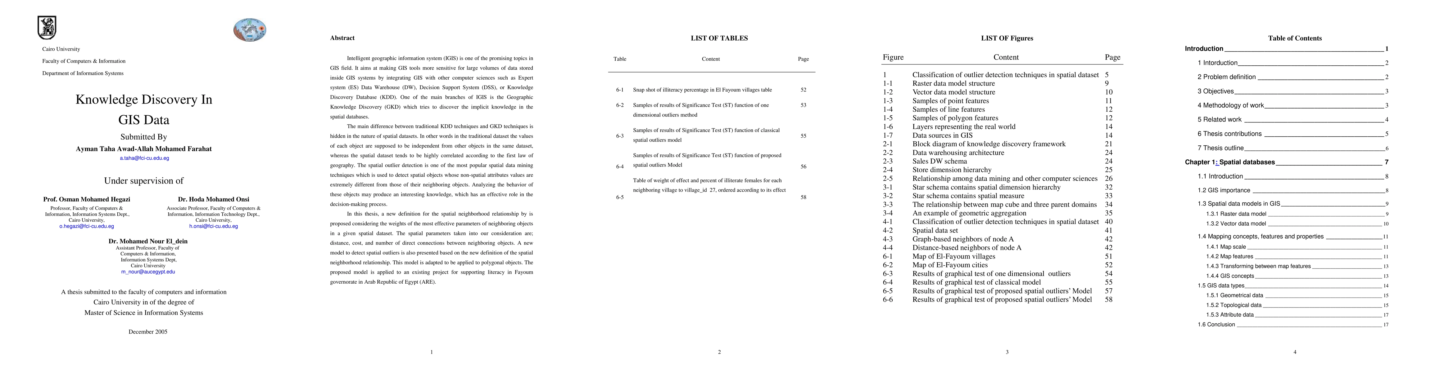 Intelligent geographic information system (IGIS) is one of the promising topics in GIS field. It aims at making GIS tools more sensitive for large volumes of data stored inside GIS systems by integrating GIS with other computer sciences such as Expert system (ES) Data Warehouse (DW), Decision Support System (DSS), or Knowledge Discovery Database (KDD). One of the main branches of IGIS is the Geographic Knowledge Discovery (GKD) which tries to discover the implicit knowledge in the spatial databases. The main difference between traditional KDD techniques and GKD techniques is hidden in the nature of spatial data sets. In other words in the traditional data set the values of each object are supposed to be independent from other objects in the same data set, whereas the spatial dataset tends to be highly correlated according to the first law of geography. The spatial outlier detection is one of the most popular spatial data mining techniques which is used to detect spatial objects whose non-spatial attributes values are extremely different from those of their neighboring objects. Analyzing the behavior of these objects may produce an interesting knowledge, which has an effective role in the decision-making process. In this thesis, a new definition for the spatial neighborhood relationship by is proposed considering the weights of the most effective parameters of neighboring objects in a given spatial dataset. The spatial parameters taken into our consideration are; distance, cost, and number of direct connections between neighboring objects. A new model to detect spatial outliers is also presented based on the new definition of the spatial neighborhood relationship. This model is adapted to be applied to polygonal objects. The proposed model is applied to an existing project for supporting literacy in Fayoum governorate in Arab Republic of Egypt (ARE).