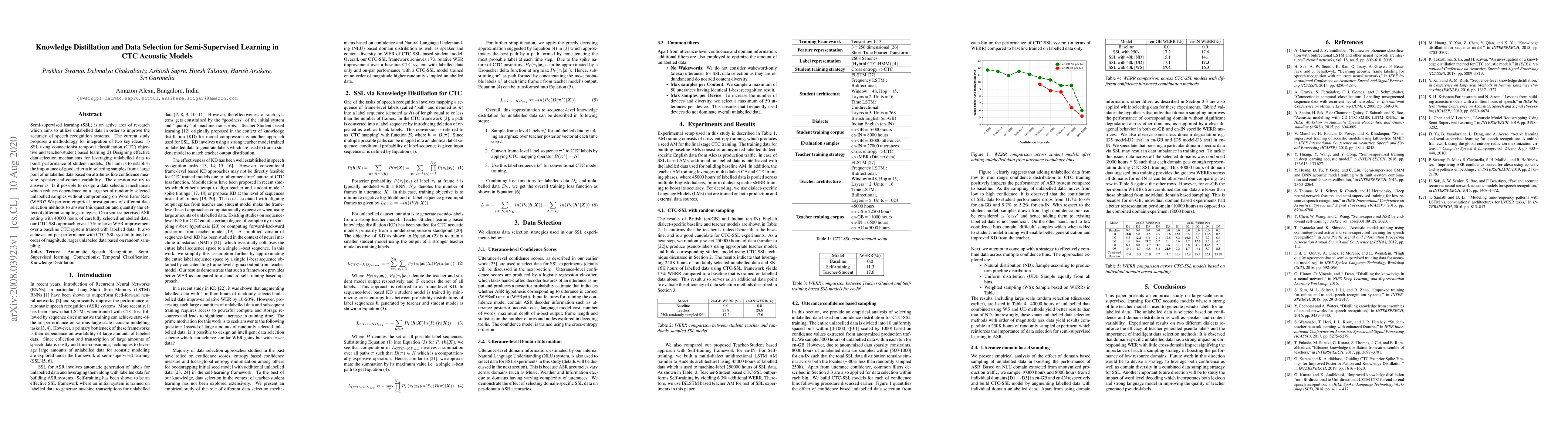 This study proposes a method for semi-supervised learning in speech recognition using connectionist temporal classification (CTC) objective and effective data selection mechanisms to leverage unlabelled data without compromising accuracy.