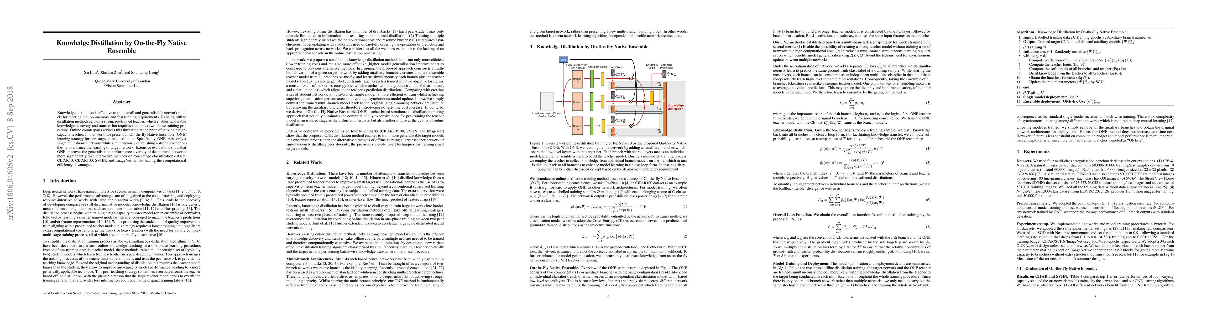 Knowledge distillation is effective to train small and generalisable network models for meeting the low-memory and fast running requirements. Existing offline distillation methods rely on a strong pre-trained teacher, which enables favourable knowledge discovery and transfer but requires a complex two-phase training procedure. Online counterparts address this limitation at the price of lacking a highcapacity teacher. In this work, we present an On-the-fly Native Ensemble (ONE) strategy for one-stage online distillation. Specifically, ONE trains only a single multi-branch network while simultaneously establishing a strong teacher on-the- fly to enhance the learning of target network. Extensive evaluations show that ONE improves the generalisation performance a variety of deep neural networks more significantly than alternative methods on four image classification dataset: CIFAR10, CIFAR100, SVHN, and ImageNet, whilst having the computational efficiency advantages.