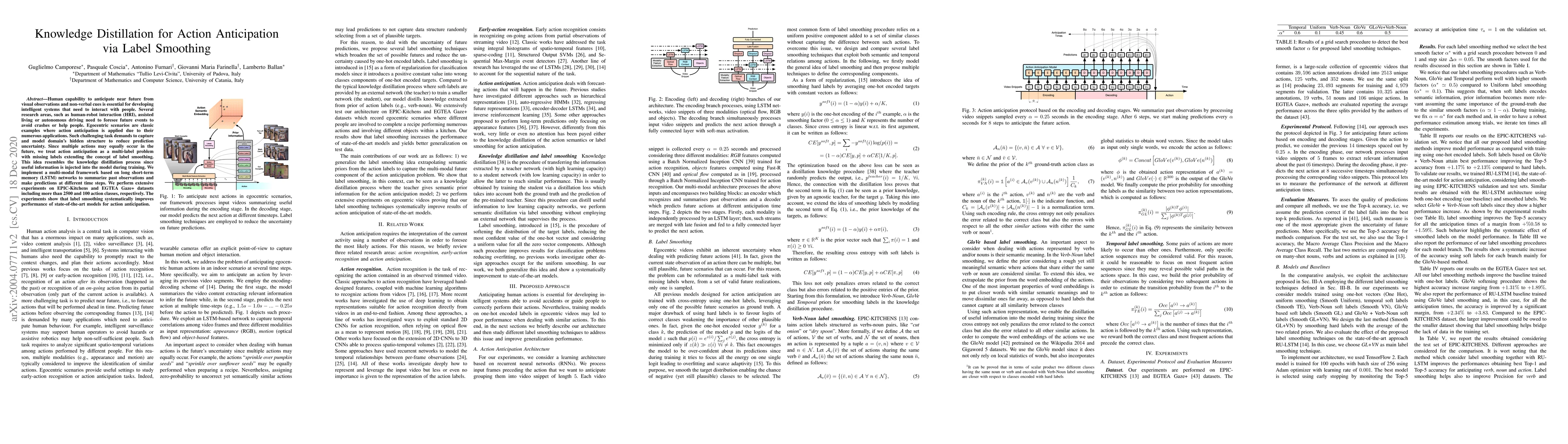 This paper proposes a knowledge distillation approach using label smoothing for action anticipation in egocentric scenarios, treating it as a multi-label problem. The multi-modal LSTM framework shows improved performance on EPIC-Kitchens and EGTEA Gaze+ datasets, demonstrating the effectiveness of the method.