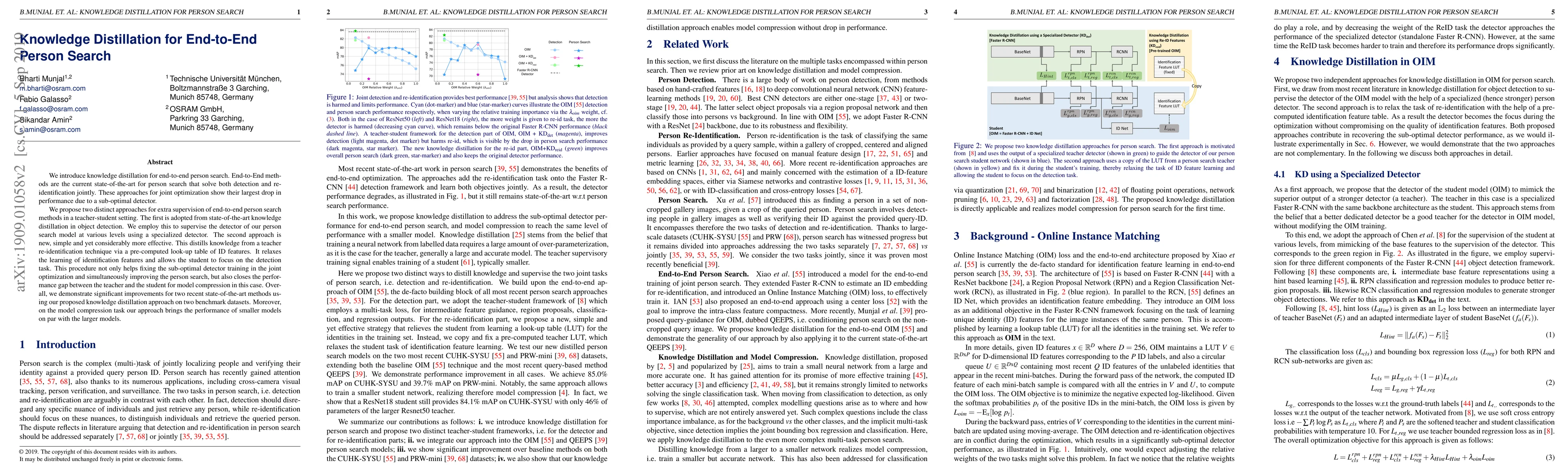 This paper proposes knowledge distillation techniques to enhance end-to-end person search methods by improving their sub-optimal detectors. It introduces two approaches: one that leverages specialized detectors and another that uses re-identification features from a teacher model, showing significant performance improvements and effective model compression.
