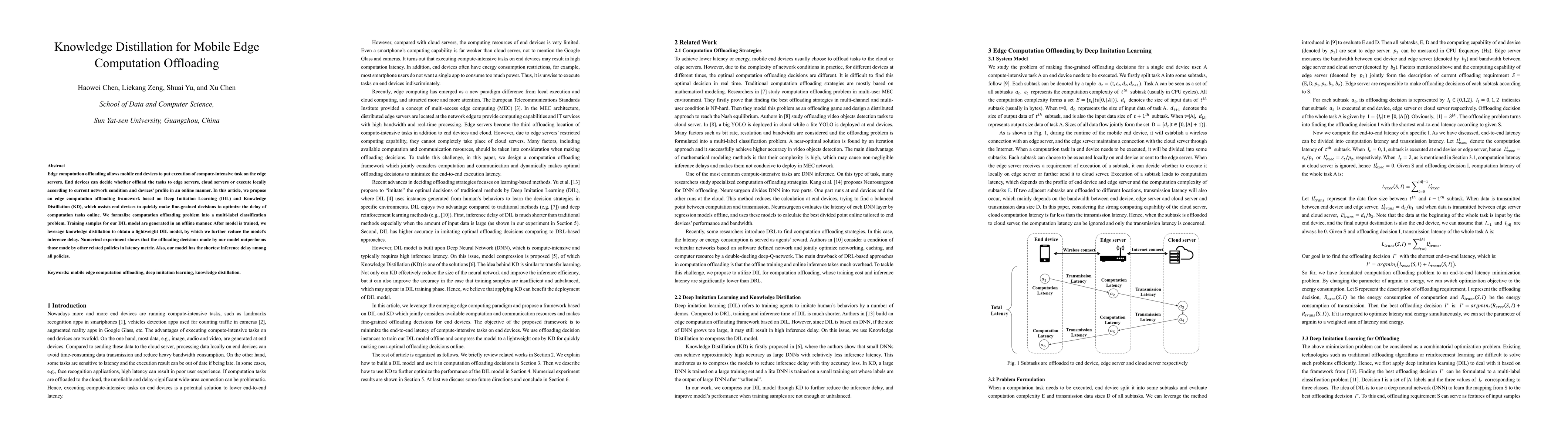 This paper proposes an edge computation offloading framework using Deep Imitation Learning and Knowledge Distillation to optimize task offloading decisions and minimize latency. The framework effectively reduces inference delay and outperforms other policies in latency metrics.